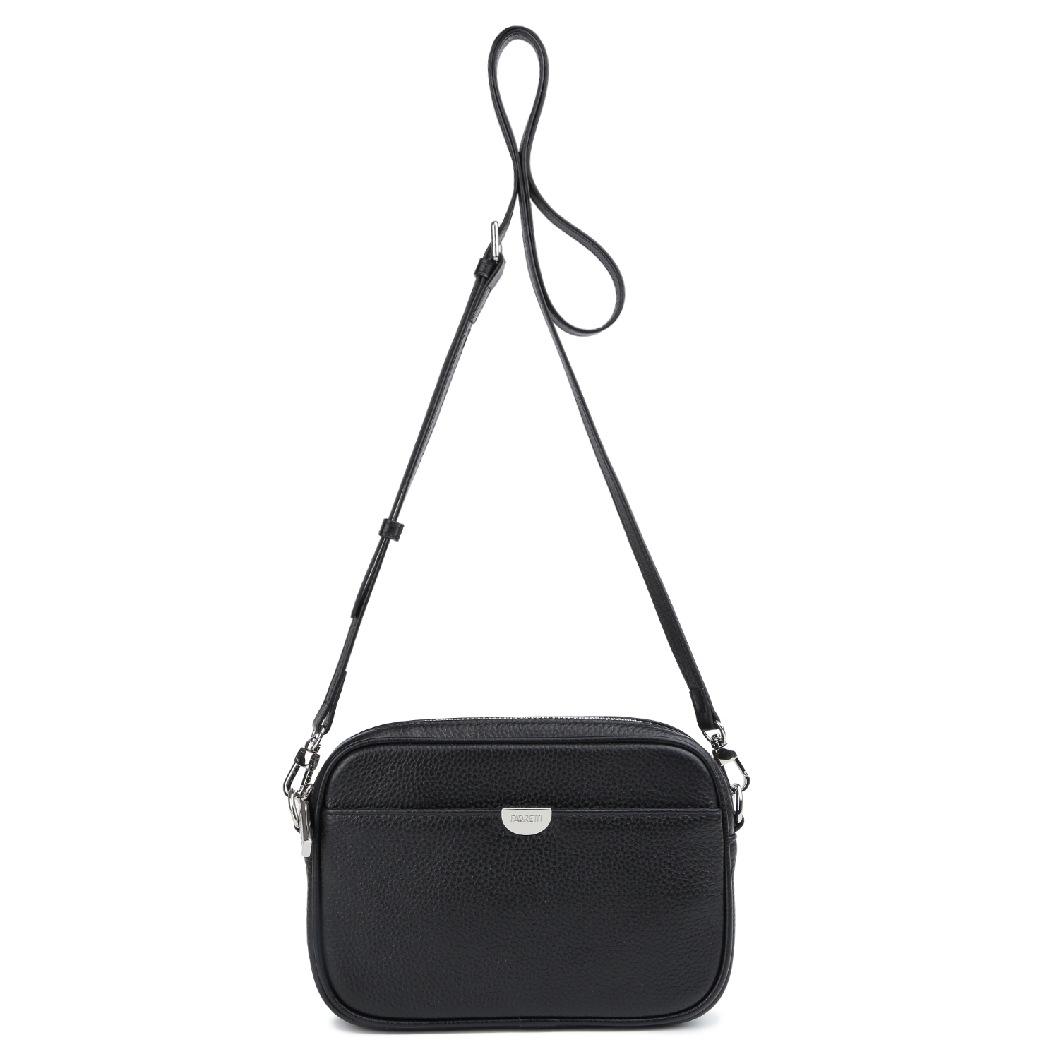 Компактная сумка-кошелек через плечо FABRETTI выполнена из натуральной зернистой кожи. Основное отделение закрывается на молнию, на лицевой стороне расположен открытый карман. Внутри есть открытый боковой карман. Плечевой ремень съемный, длина - 115 см, ширина - 1 см. Цвет фурнитуры - серебро.