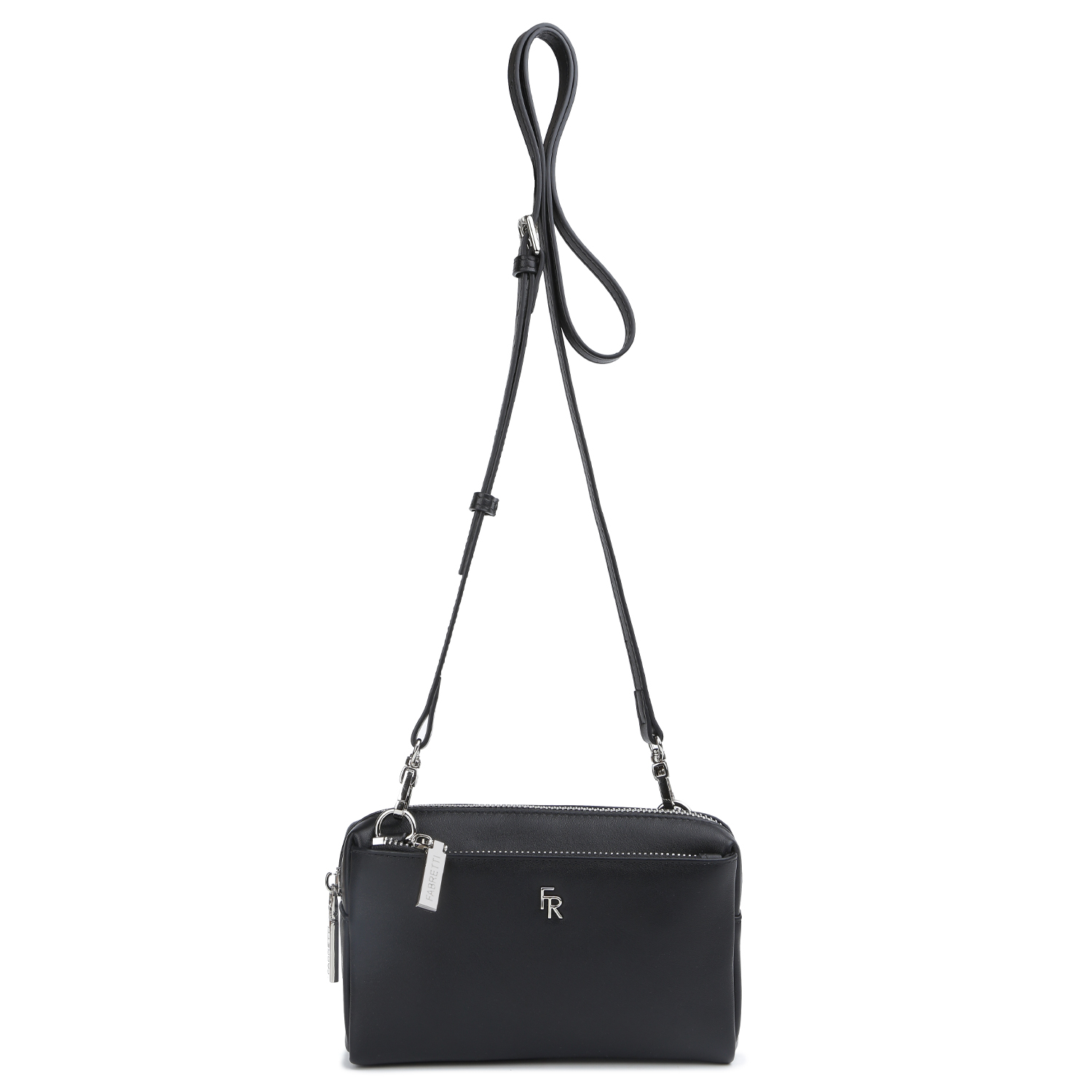 Компактная сумка-кошелек через плечо FABRETTI выполнена из натуральной гладкой кожи. Основное отделение закрывается на молнию, на внешней стороне расположены 2 кармана на молнии. Внутри есть 1 карман на молнии и 1 открытый карман. Плечевой ремень съемный, длина - 115 см, ширина - 1 см. Цвет фурнитуры - серебро.