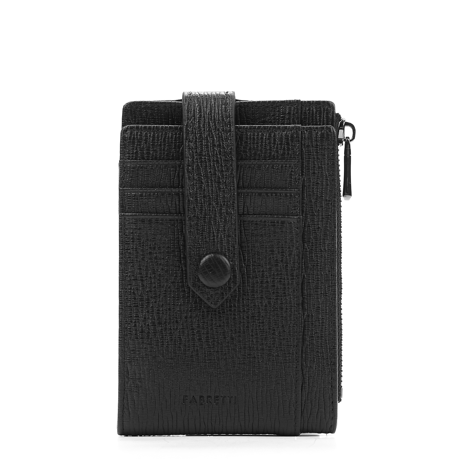 Современный мужской складной картхолдер итальянского бренда FABRETTI – продуманная модель, которая удивит вас своим функциональным дизайном. Она выполнена из натуральной кожи с рельефным тиснением в классическом черном цвете.