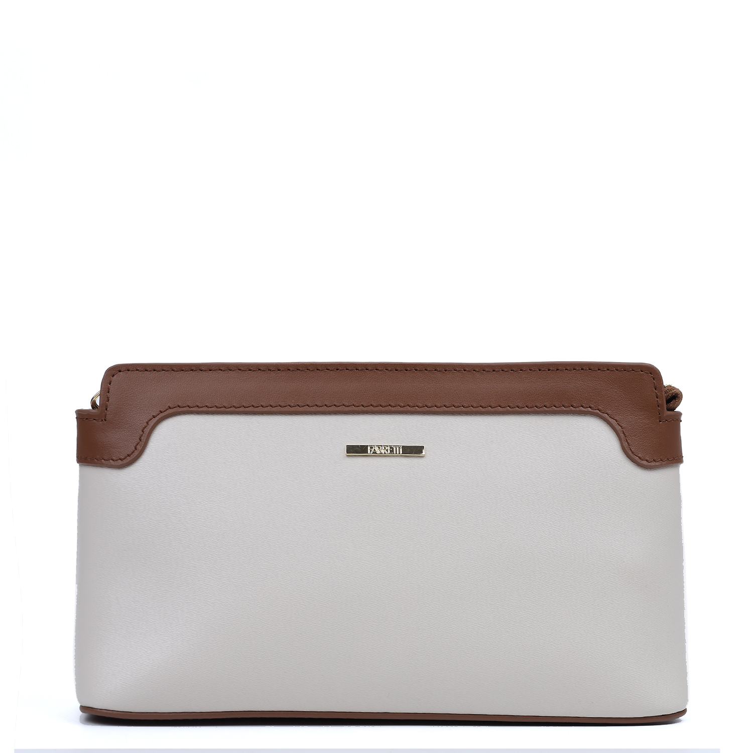 Женская косметичка итальянского бренда FABRETTI из натуральной кожи с гладкой фактурой и мелкозернистым узором. Выполнена в необычном цветовом решении: основная часть светло-бежевого цвета дополнена светло-коричневым дном и аналогичной отделкой по верху.