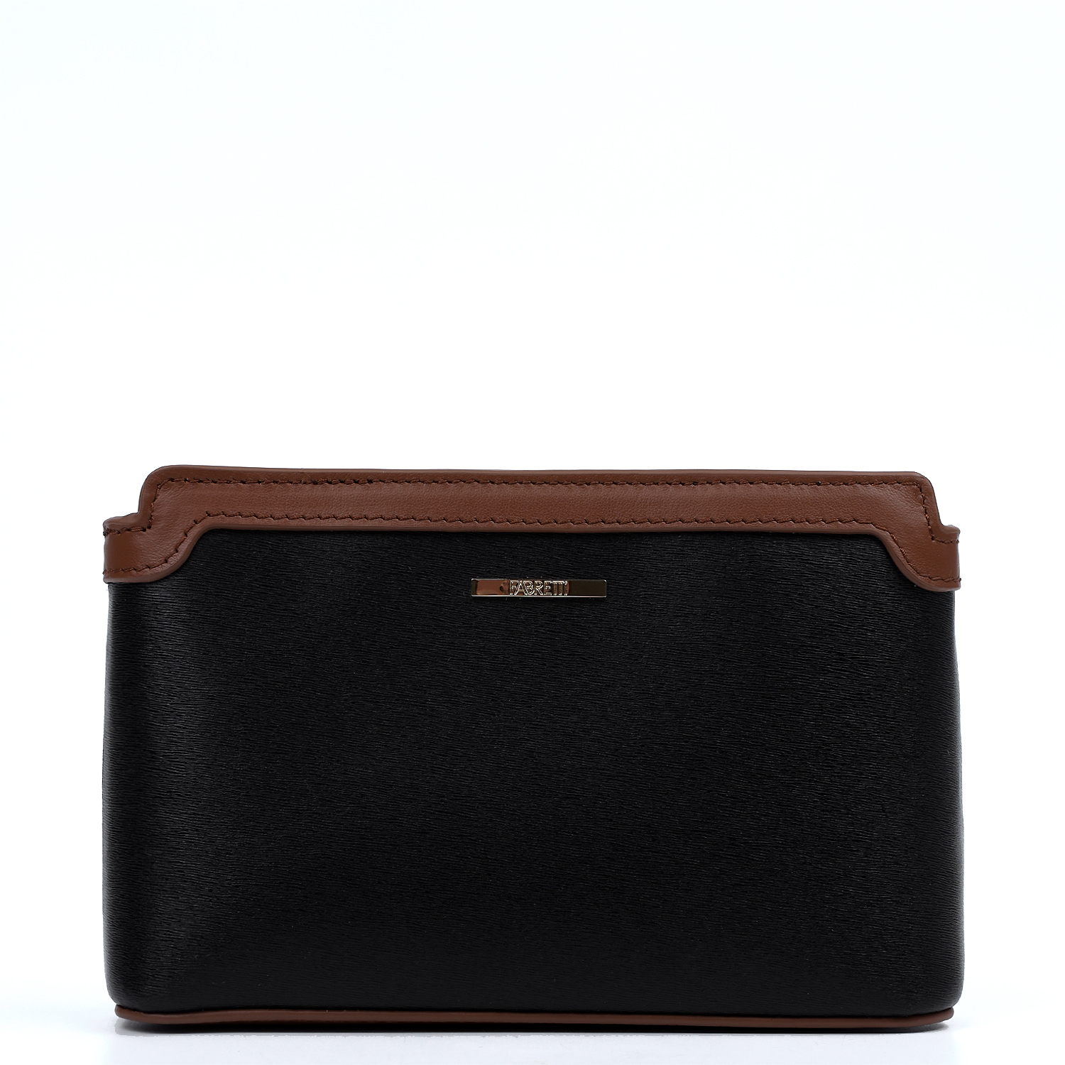 Женская косметичка итальянского бренда FABRETTI из натуральной кожи с гладкой фактурой и мелкозернистым узором. Выполнена в необычном цветовом решении: основная часть черного цвета дополнена светло-коричневым дном и аналогичной отделкой по верху.