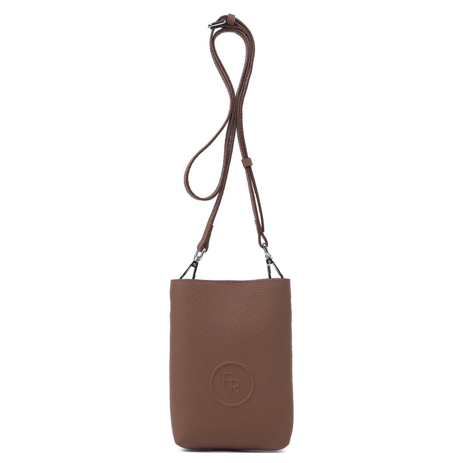 Компактная вертикальная женская  сумка для телефона через плечо итальянского бренда FABRETTI выполнена из натуральной крупнозернистой кожи коричневого оттенка. Основное отделение закрывается на магнитный замок. На лицевой стороне тиснение в виде фирменного логотипа, на тыльной стороне открытый накладной карман.