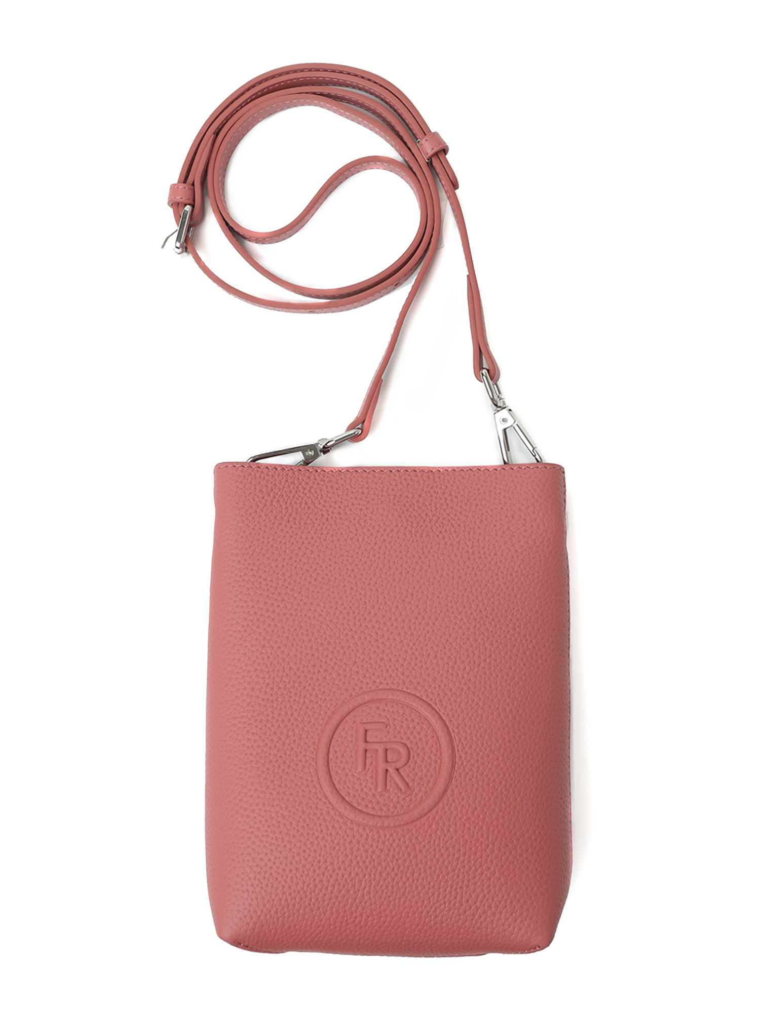 Компактная вертикальная женская сумка-кошелек через плечо итальянского бренда FABRETTI выполнена из натуральной крупнозернистой кожи в нежном оттенке «пыльная роза». Основное отделение закрывается на магнитный замок. На лицевой стороне тиснение в виде фирменного логотипа, на тыльной стороне открытый накладной карман.