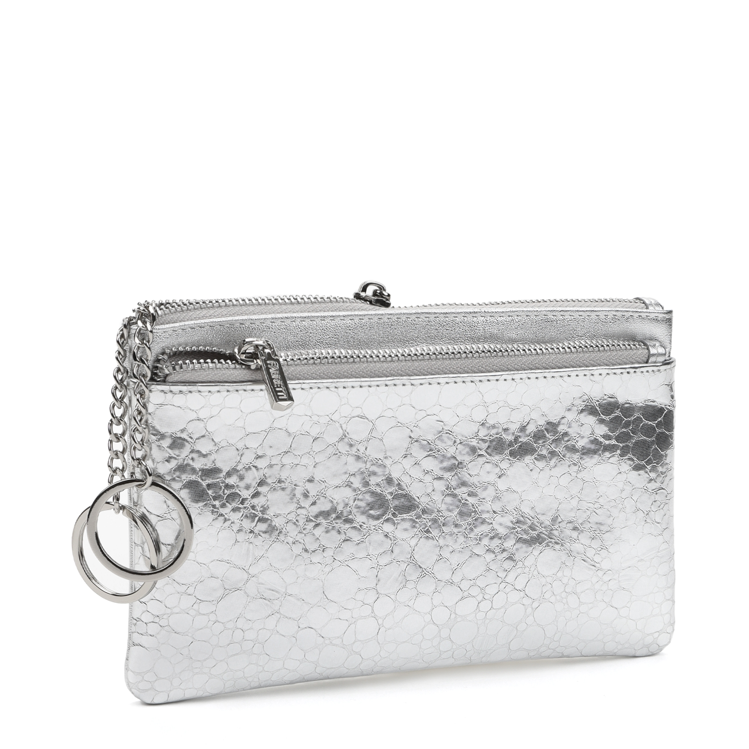 Модель в необычном серебряном оттенке сочетает нежную кожу наппа двух фактур – гладкую матовую и блестящую, металлизированную кожу с крупным узором.