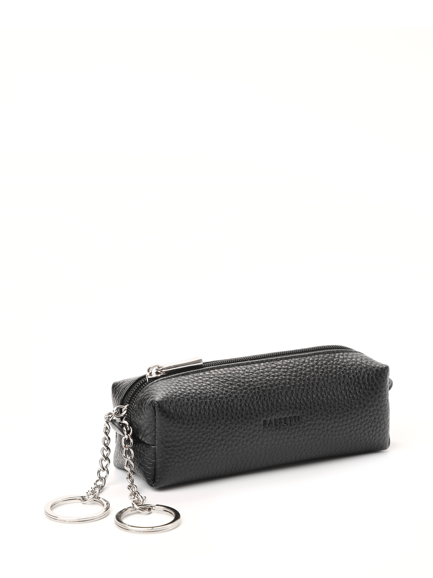 Удобная компактная ключница итальянского бренда FABRETTI выполнена из натуральной кожи крупнозернистой фактуры черного цвета. Внутри - одно отделение для ключей с двумя кольцами-держателями на цепочках.  У модели удобная миниатюрная пластиковая молния.