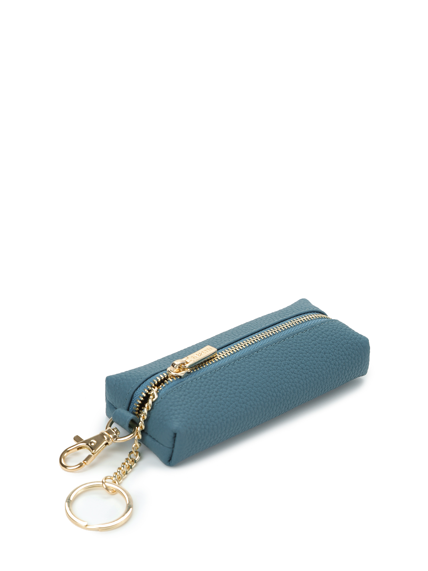 Внутри одно отделение для ключей и удобный металлический держатель на цепочке. На внешней стороне предусмотрен карабин. Аксессуар закрывается на металлическую молнию. Цвет фурнитуры – золото.