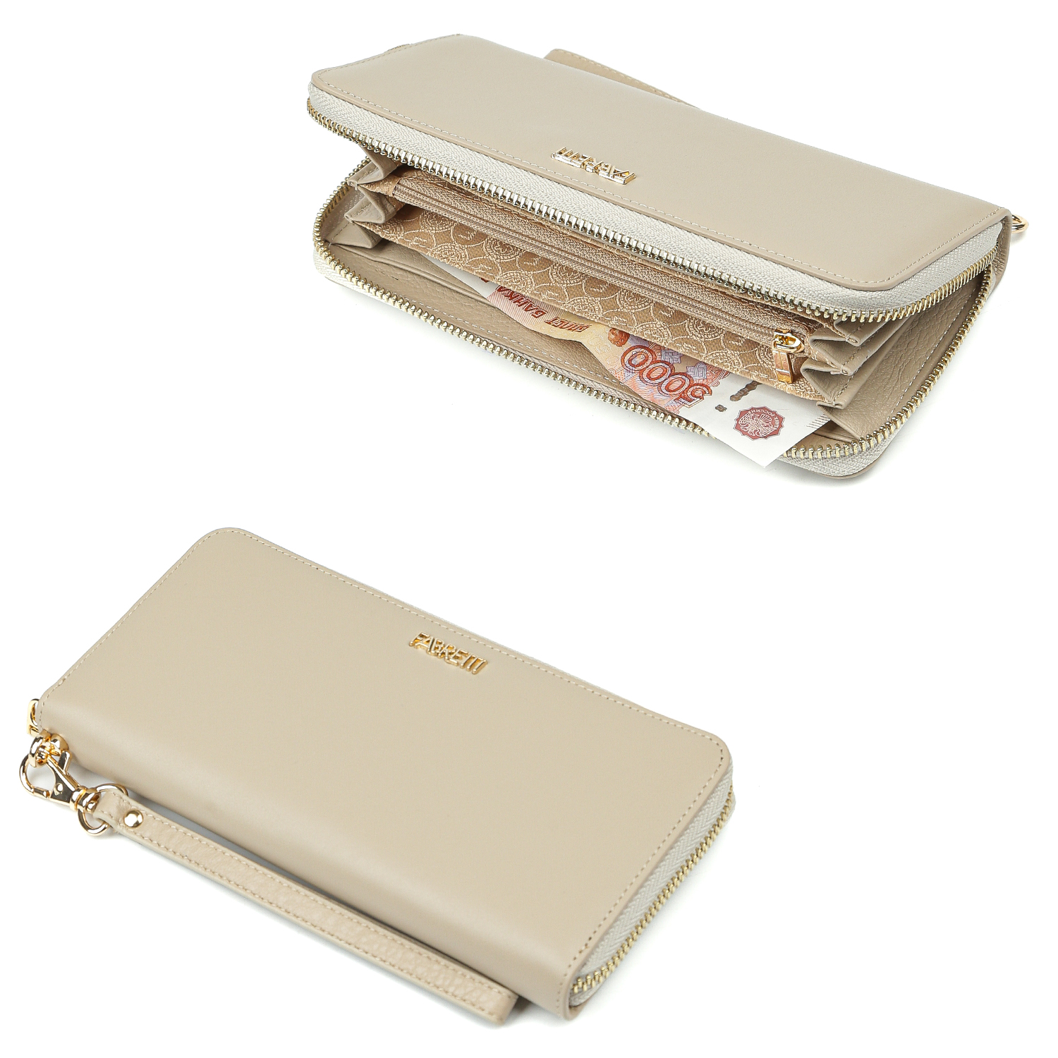 Вместительный женский кошелек FABRETTI в бежевом оттенке выполнен из натуральной кожи гладкой фактуры. Основное отделение закрывается на полукруглую молнию. Внутри 4 отделения на полную купюру, карман на молнии - для мелочи, 1 слот с прозрачной пленкой для проездного или пропуска, 2 открытых боковых кармана и 8 слотов для банковских карт. На тыльной стороне расположен карман быстрого доступа на молнии. Практичный аксессуар дополнен удобным съемным ремешком и при необходимости может выполнить функцию клатча, поскольку с легкостью вместит паспорт, смартфон и другие мелочи. Цвет фурнитуры - золото.