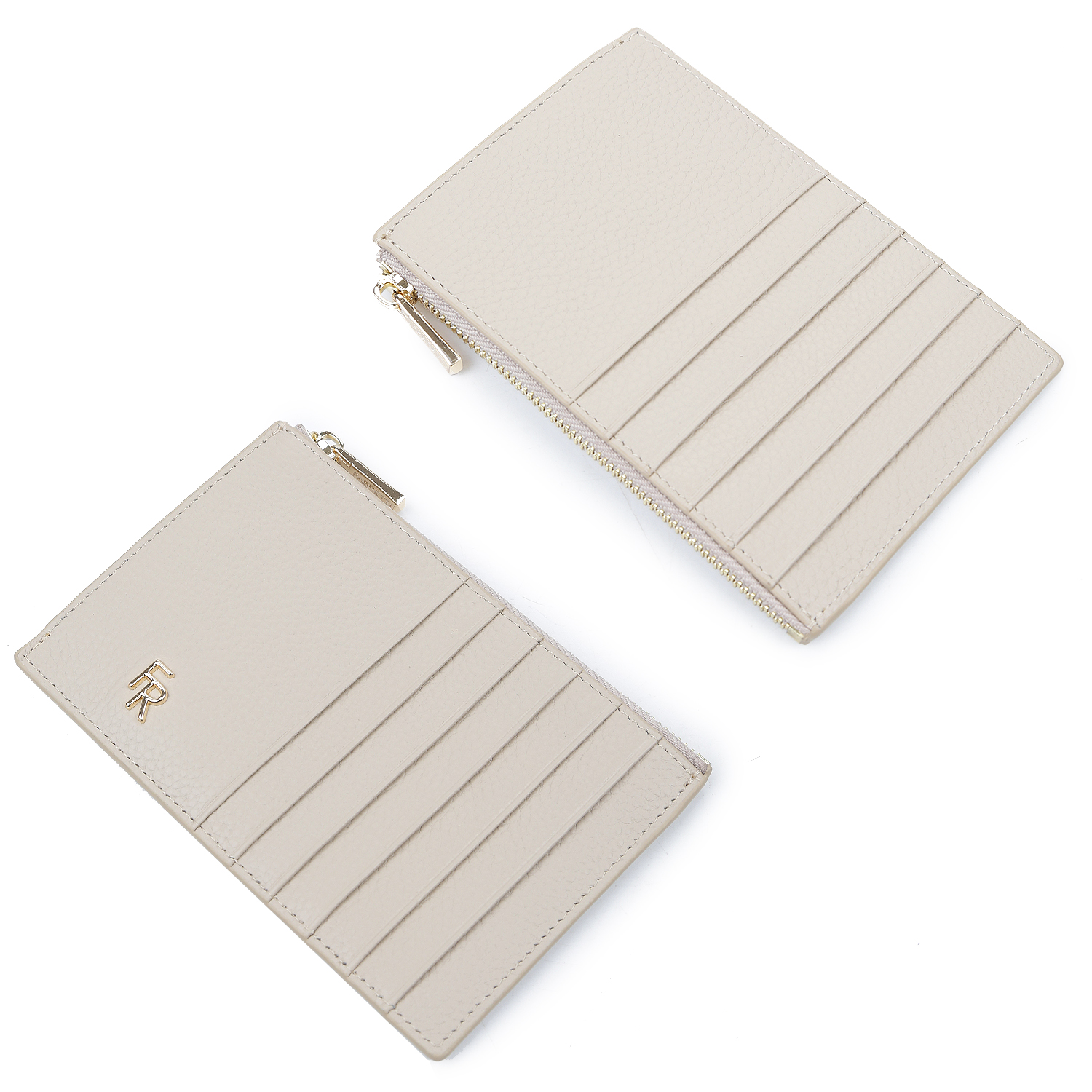 Визитница выполнена из натуральной крупнозернистой кожи в светло-бежевом оттенке; имеет одно основное отделение на молнии и по шесть слотов для карт с обеих сторон. На боку расположен небольшой металлический логотип.