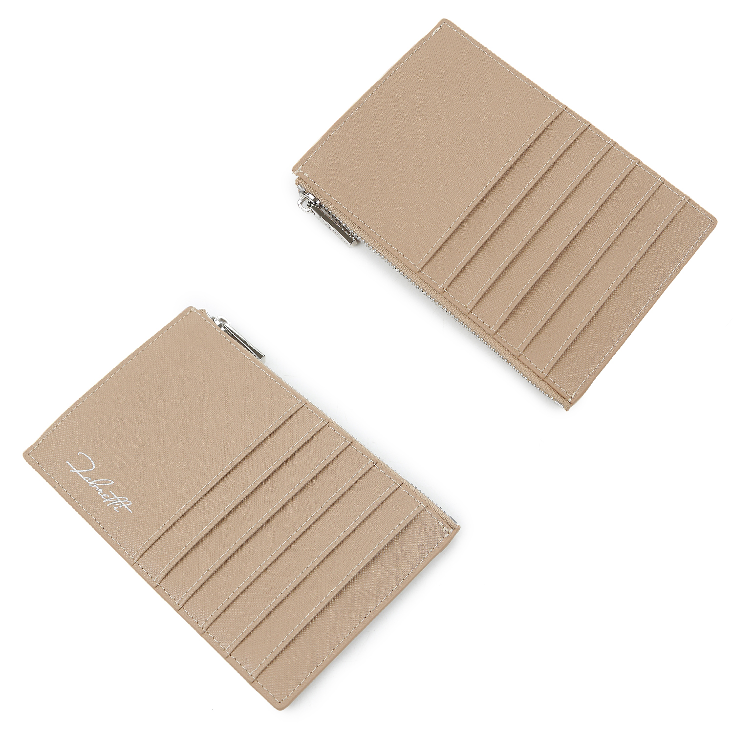 Визитница выполнена из натуральной кожи с тиснением сафьяно в светлом бежевом цвете; имеет одно основное отделение на молнии и по шесть слотов для карт с обеих сторон. На боку расположен небольшой  логотип.
