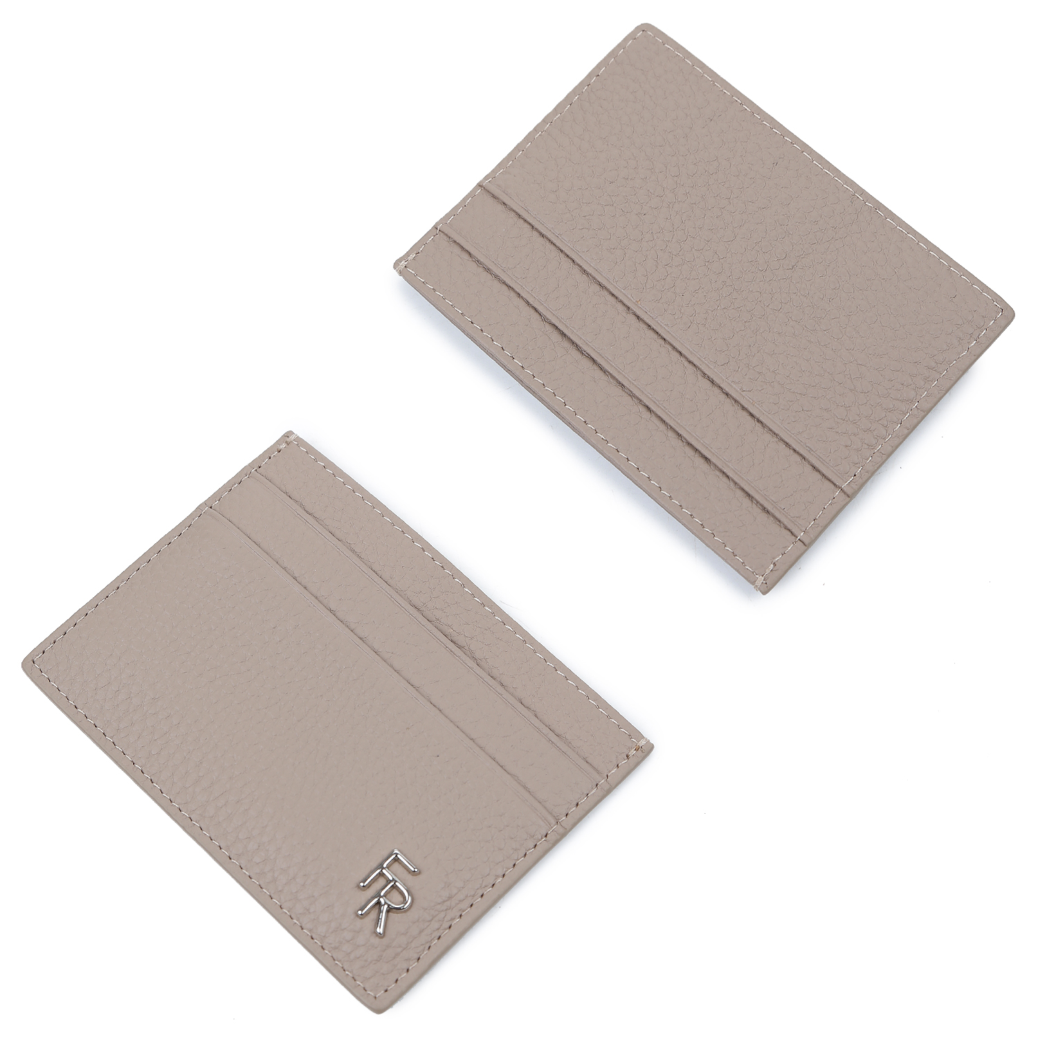 Визитница выполнена из натуральной крупнозернистой кожи в светло-бежевом оттенке; имеет одно основное отделение и по три слота для карт с обеих сторон.