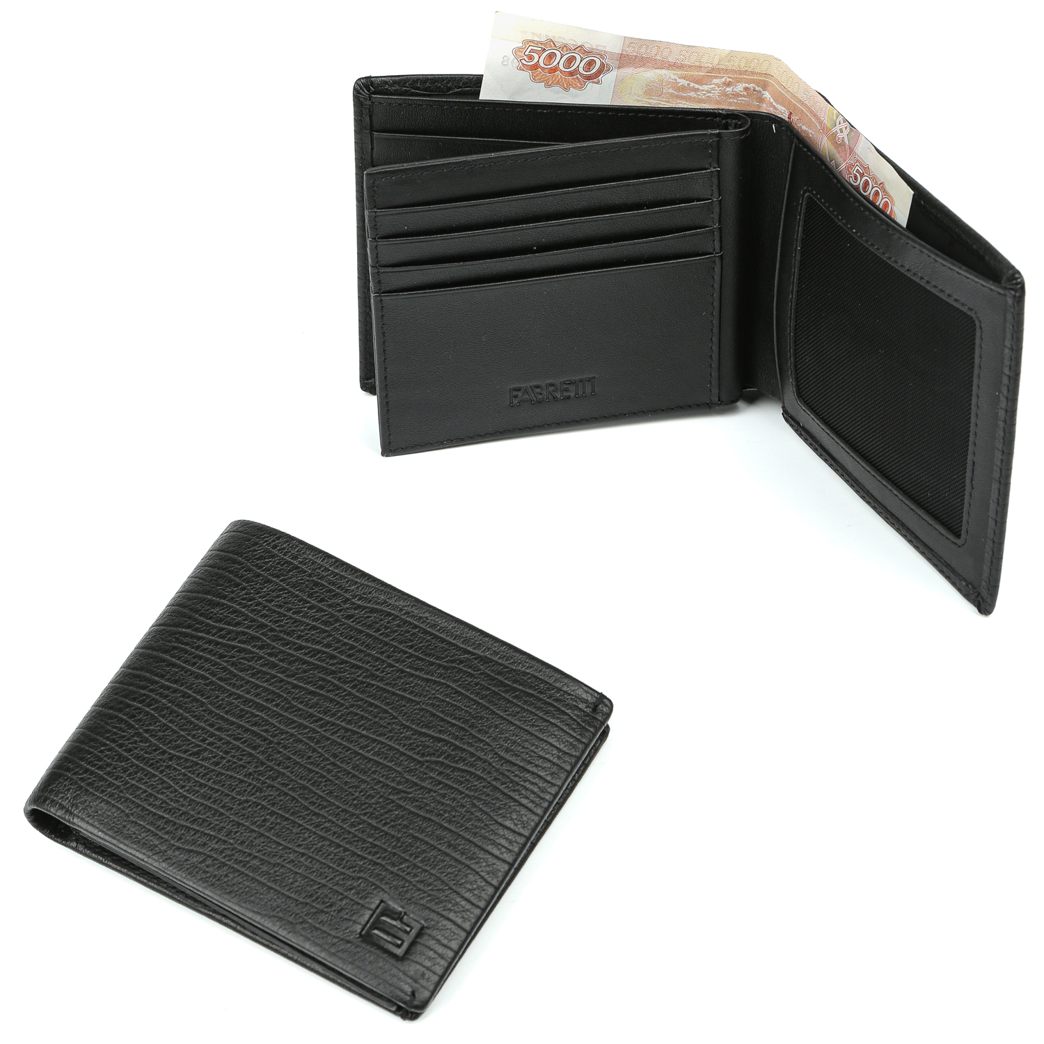 Практичный складной кошелек FABRETTI выполнен из натуральной зернистой кожи в черном цвете и декорирован фактурным тиснением. Внутри 2 отделения для купюр, 11 слотов для пластиковых карт, 5 открытых карманов, один из которых с сетчатой вставкой. Кошелек не имеет застежки.