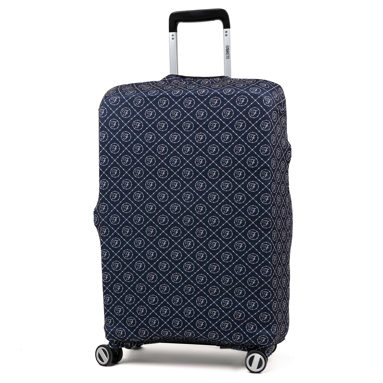 Стильный чехол итальянского бренда FABRETTI с изящным узором в стиле логомании на темно-синем фоне подойдет для чемодана большого размера L. Созданный из высокотехнологичного полиэстера и спандекса, он эластичен, вынослив и прост в уходе. Чехол поможет защитить багаж от загрязнений и царапин. Кроме того, сэкономит время и деньги на упаковке чемодана в багажную пленку в аэропорту. Благодаря оригинальному дизайну чемодан будет легко найти на багажной ленте в аэропорту.