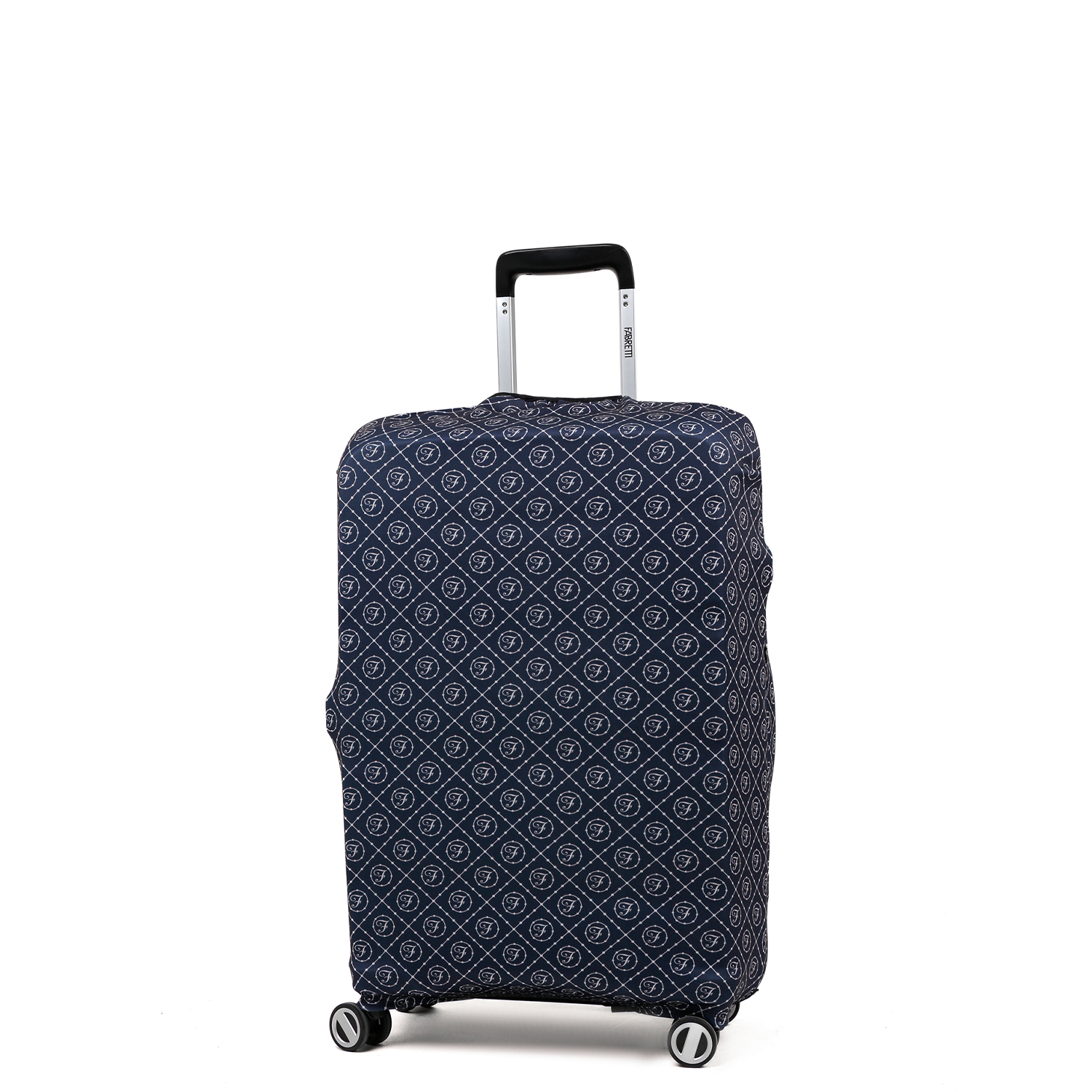 Стильный чехол итальянского бренда FABRETTI с изящным узором в стиле логомании на темно-синем фоне подойдет для чемодана маленького размера S.  Созданный из высокотехнологичного полиэстера и спандекса, он эластичен, вынослив и прост в уходе. Чехол поможет защитить багаж от загрязнений и царапин. Кроме того, сэкономит время и деньги на упаковке чемодана в багажную пленку в аэропорту. Благодаря оригинальному дизайну чемодан будет легко найти на багажной ленте в аэропорту.