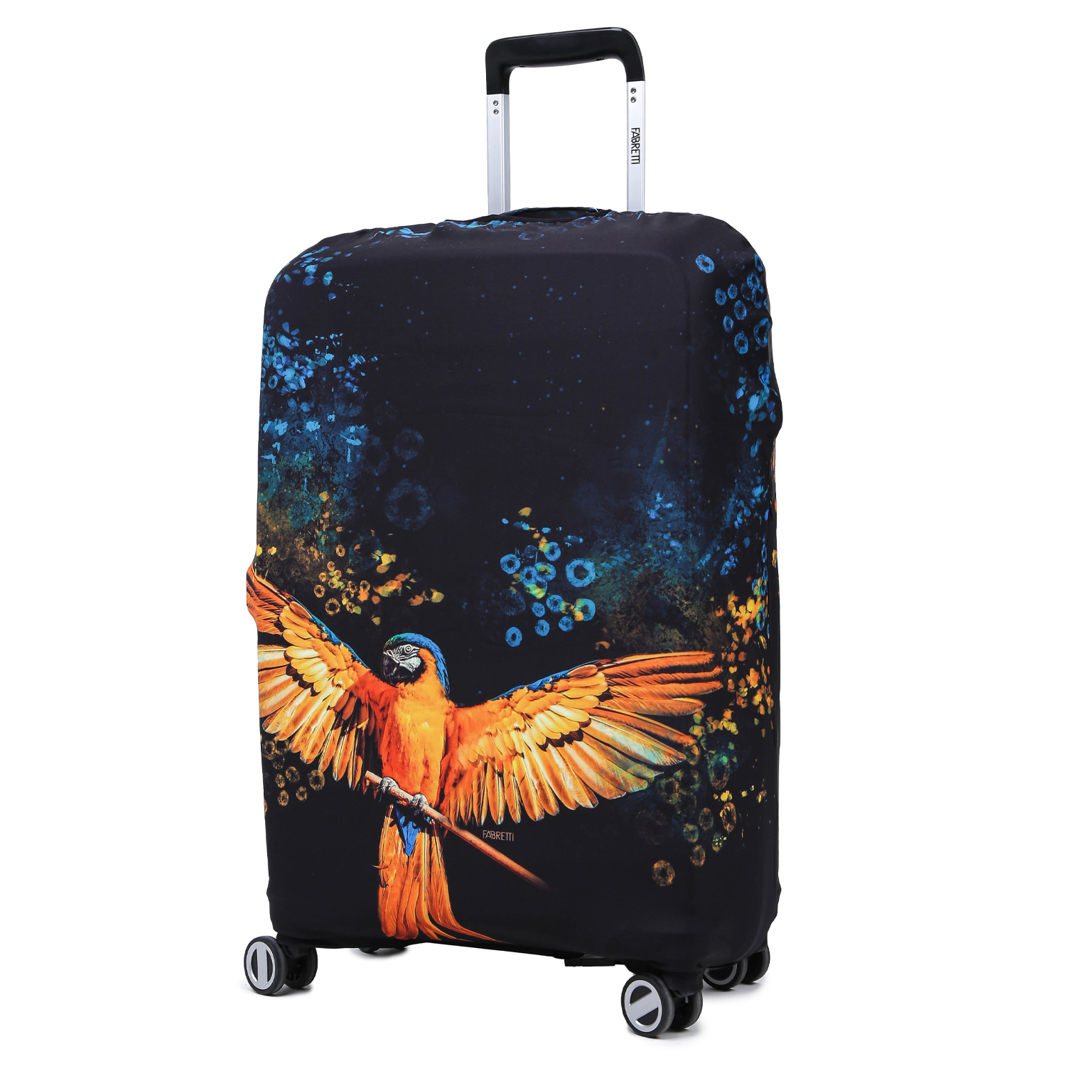 Яркий чехол итальянского бренда FABRETTI с распахнувшим крылья тропическим попугаем ара на черном фоне подойдет для чемодана большого размера L. Созданный из высокотехнологичного полиэстера и спандекса, он эластичен, вынослив и прост в уходе. Чехол поможет защитить багаж от загрязнений и царапин. Кроме того, сэкономит время и деньги на упаковке чемодана в багажную пленку в аэропорту. Благодаря оригинальному дизайну чемодан будет легко найти на багажной ленте в аэропорту.