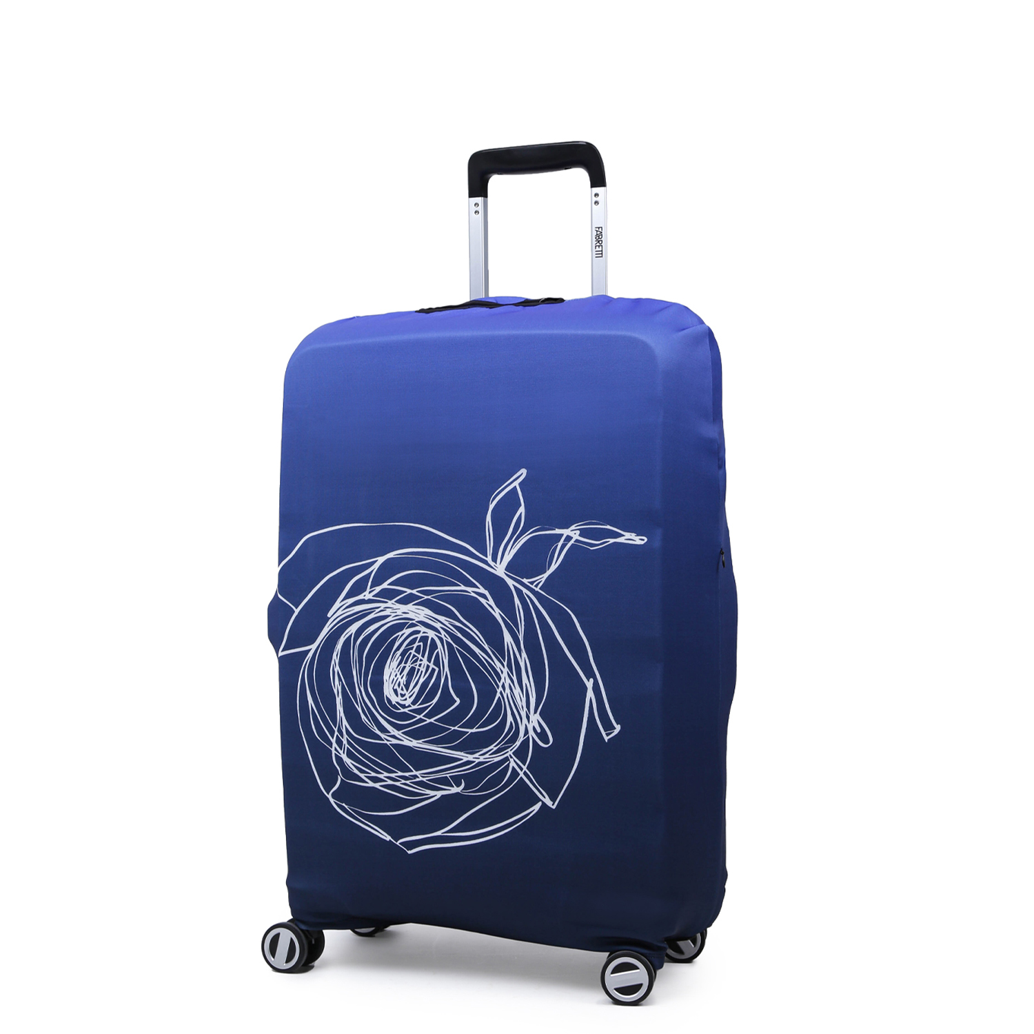 Стильный чехол итальянского бренда FABRETTI с элегантным цветочным узором на синем фоне подойдет для чемодана среднего размера M.  Созданный из высокотехнологичного полиэстера и спандекса, он эластичен, вынослив и прост в уходе. Чехол поможет защитить багаж от загрязнений и царапин. Кроме того, сэкономит время и деньги на упаковке чемодана в багажную пленку в аэропорту. Благодаря оригинальному дизайну чемодан будет легко найти на багажной ленте в аэропорту. Обратите внимание, чехол размера М подходит для чемоданов с расширением объема.
