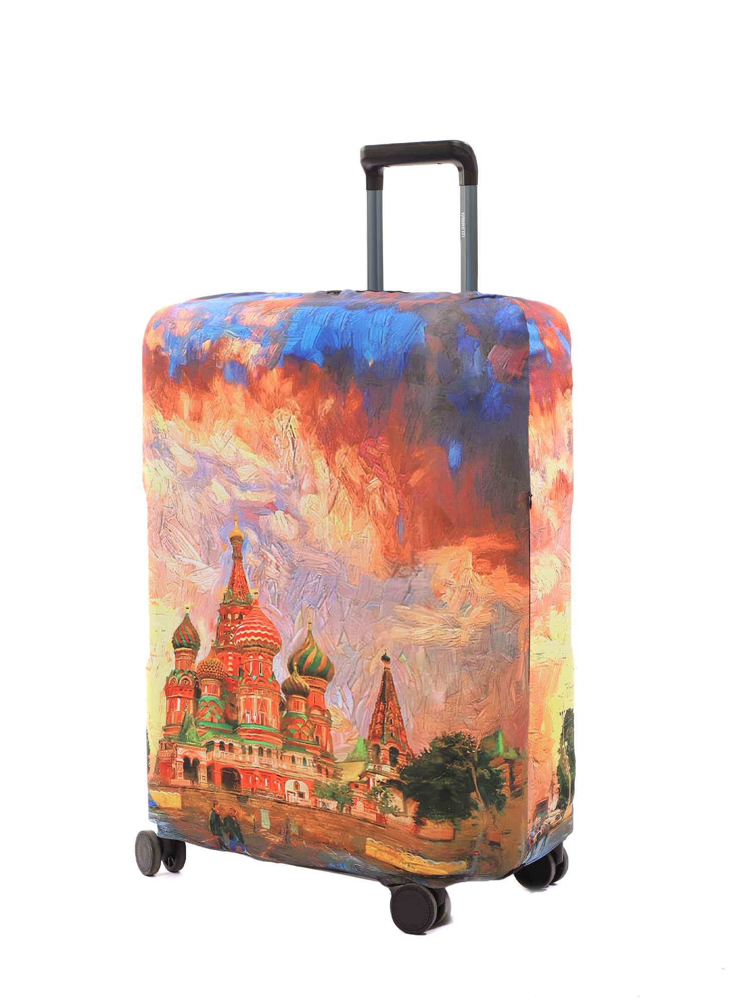 Стильный чехол итальянского бренда FABRETTI с ярким живописным принтом Красной Площади подойдет для чемодана среднего размера M.  Созданный из высокотехнологичного полиэстера и спандекса, он эластичен, вынослив и прост в уходе. Чехол поможет защитить багаж от загрязнений и царапин. Кроме того, сэкономит время и деньги на упаковке чемодана в багажную пленку в аэропорту. Благодаря оригинальному дизайну чемодан будет легко найти на багажной ленте в аэропорту.