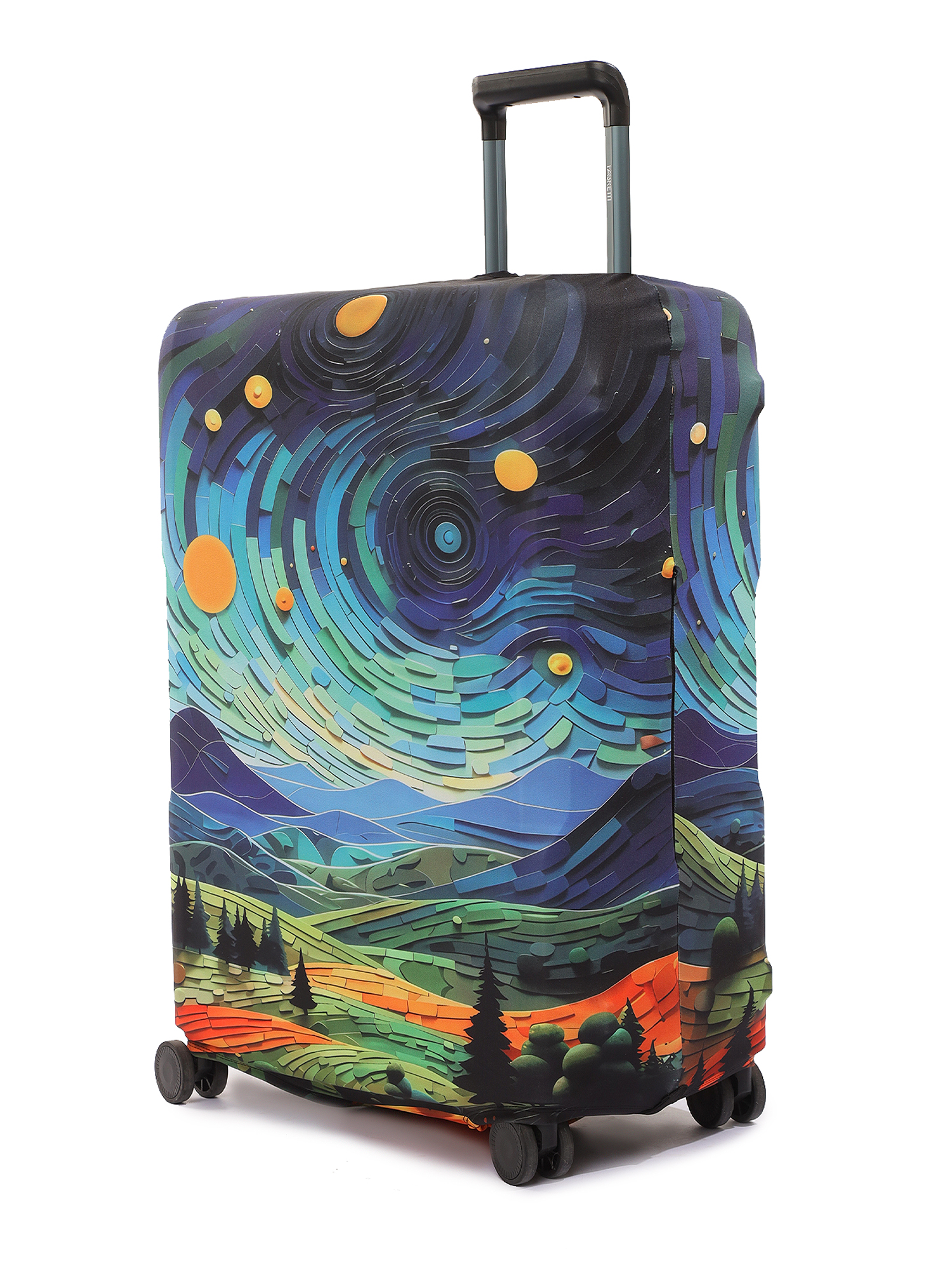 Стильный чехол итальянского бренда FABRETTI с ярким цветным пейзажным принтом подойдет для чемодана большого размера L. Созданный из высокотехнологичного полиэстера и спандекса, он эластичен, вынослив и прост в уходе. Чехол поможет защитить багаж от загрязнений и царапин. Кроме того, сэкономит время и деньги на упаковке чемодана в багажную пленку в аэропорту. Благодаря оригинальному дизайну чемодан будет легко найти на багажной ленте в аэропорту.