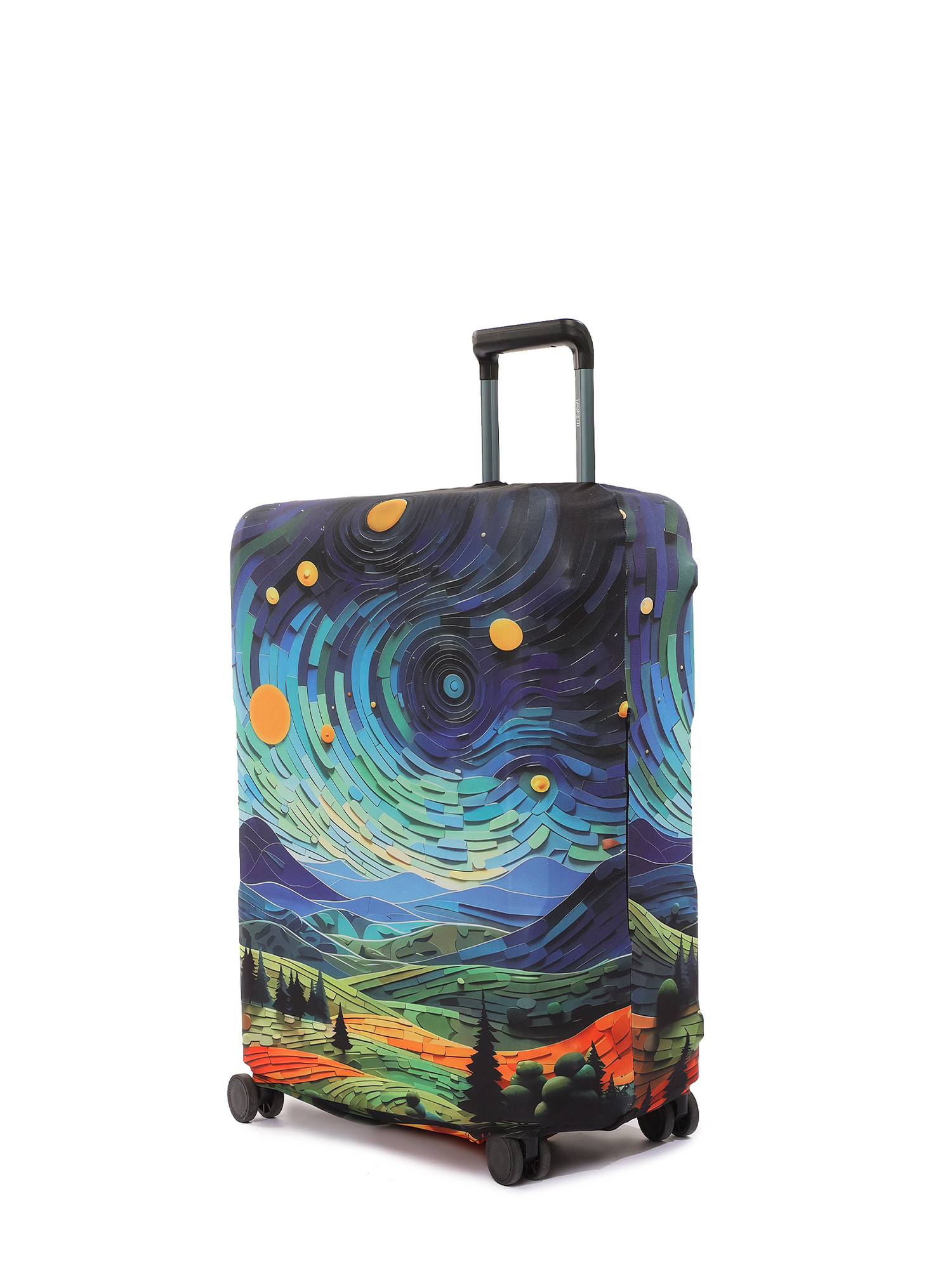 Стильный чехол итальянского бренда FABRETTI с ярким цветным пейзажным принтом подойдет для чемодана маленького размера S. Созданный из высокотехнологичного полиэстера и спандекса, он эластичен, вынослив и прост в уходе. Чехол поможет защитить багаж от загрязнений и царапин. Кроме того, сэкономит время и деньги на упаковке чемодана в багажную пленку в аэропорту. Благодаря оригинальному дизайну чемодан будет легко найти на багажной ленте в аэропорту.
