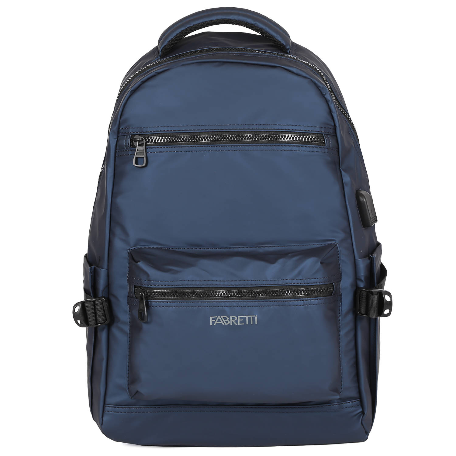 Стильный рюкзак FABRETTI в темно-синем оттенке выполнен из влагостойкого гладкого нейлона и оснащен USB-кабелем и USB-портом. Удобная мягкая спинка, создает дополнительный комфорт при ношении. Мягкие лямки имеют особую форму и конструкцию, что способствует комфорту во время носки. Рюкзак состоит из одного отделения, которое закрывается на пластмассовую молнию. Внутри - отделение для ноутбука, открытый настенный карман, а также сетчатый карман на молнии для хранения внешнего аккумулятора. На фронтальной части размещаются два вместительных кармана на молнии. Также имеются два боковых кармана быстрого доступа и потайной карман в спинке. Рюкзак прекрасно подойдёт для прогулок по городу, велосипедных поездок или путешествий и поможет обеспечить бесперебойную работу необходимых гаджетов.