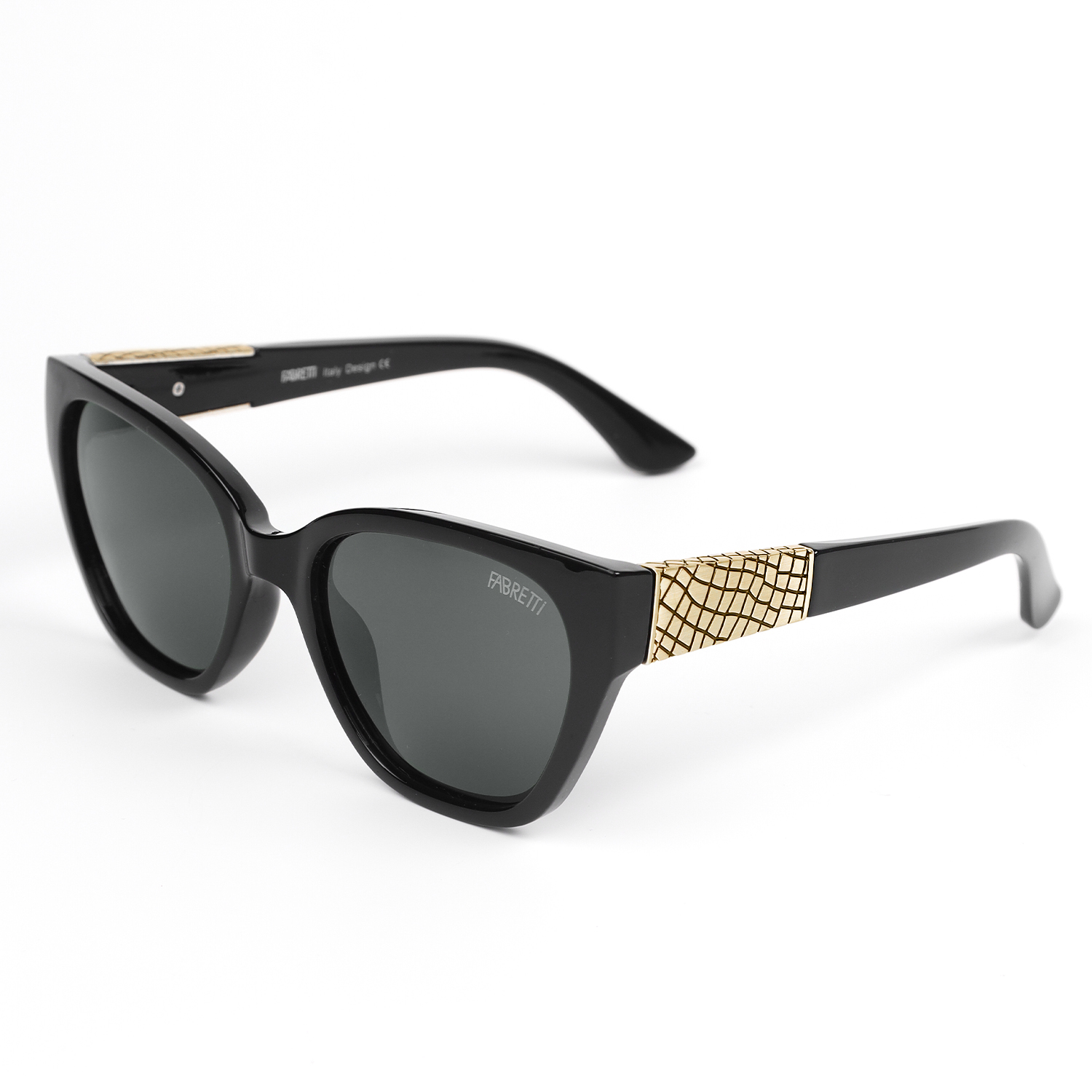 Поляризационные женские солнцезащитные очки итальянского бренда FABRETTI в глянцевой черной оправе "кошачий глаз" с золотистыми вставками на дужках. Однотонные серые линзы позволяют видеть одинаково хорошо как в помещении, так и на солнечной улице.
