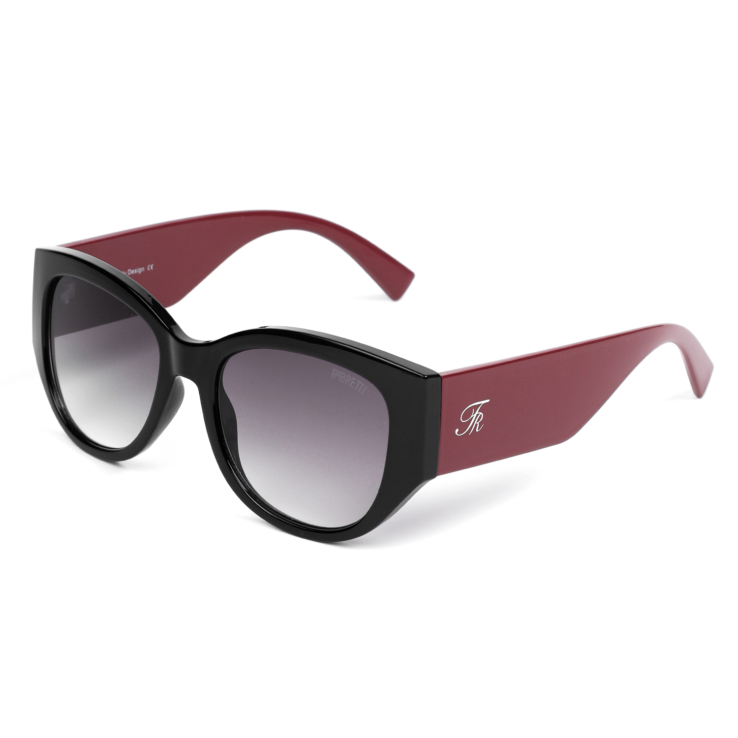 Женские солнцезащитные очки итальянского бренда FABRETTI в глянцевой черной оправе "кошачий глаз" с широкими дужками приглушенного бордового оттенка. Градиентные серо-голубые линзы позволяют видеть одинаково хорошо как в помещении, так и на солнечной улице.