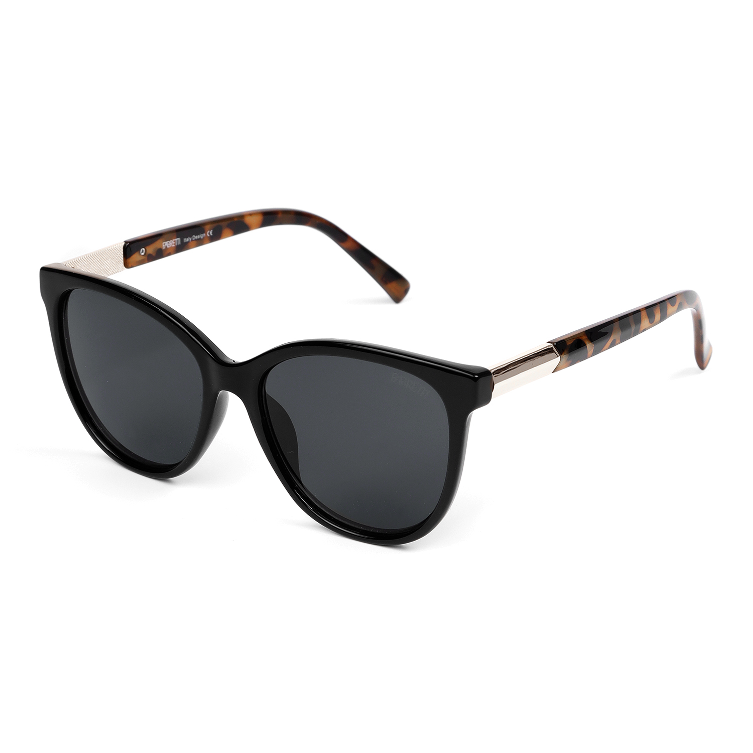 Изящные женские солнцезащитные очки итальянского бренда FABRETTI в черной оправе "кошачий глаз" с полупрозрачными дужками с анималистичным узором. Однотонные серые линзы позволяют видеть одинаково хорошо как в помещении, так и на солнечной улице.