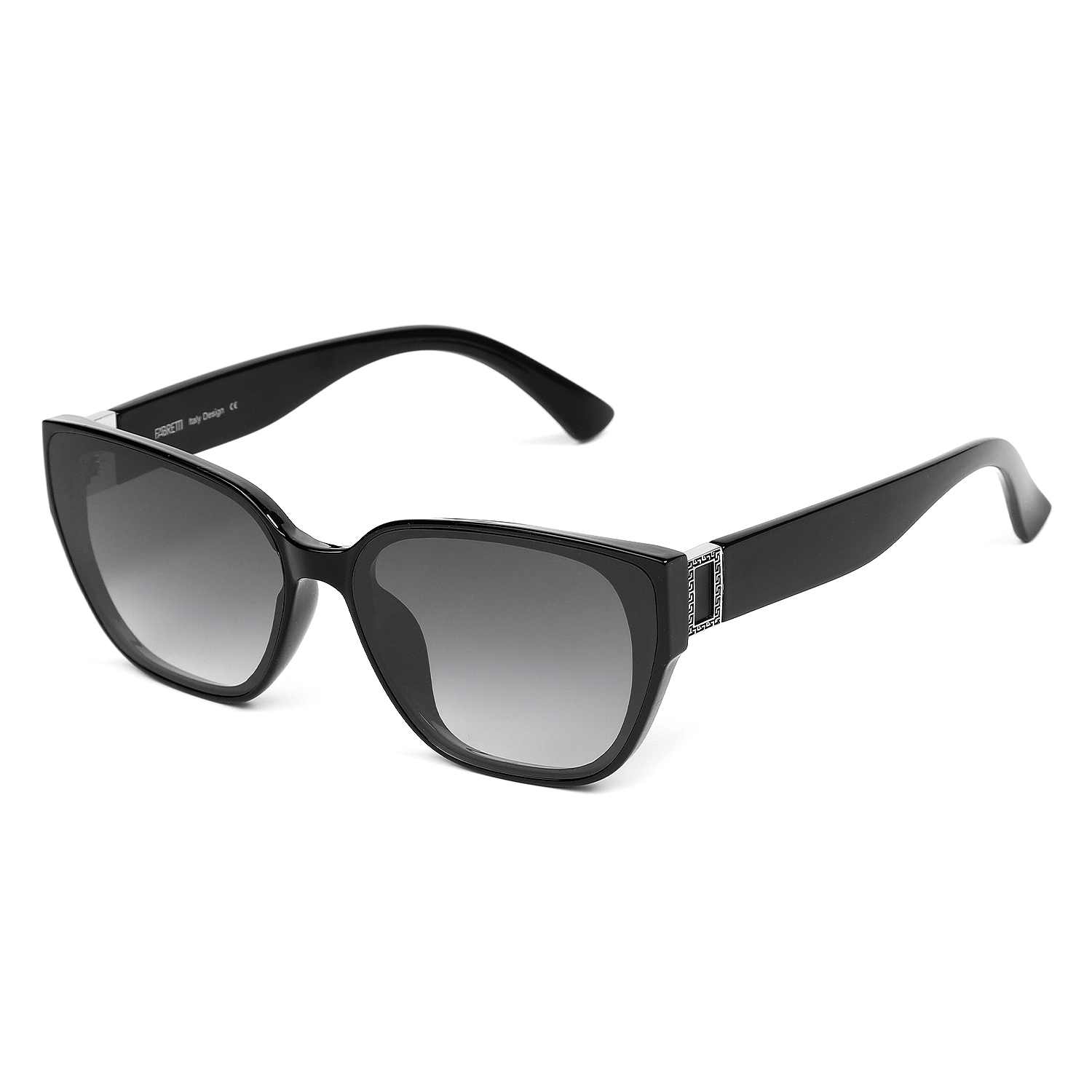 Элегантные солнцезащитные очки итальянского бренда FABRETTI в тонкой черной оправе в форме "кошачий глаз". Градиентные серые линзы позволяют видеть одинаково хорошо как в помещении, так и на солнечной улице.