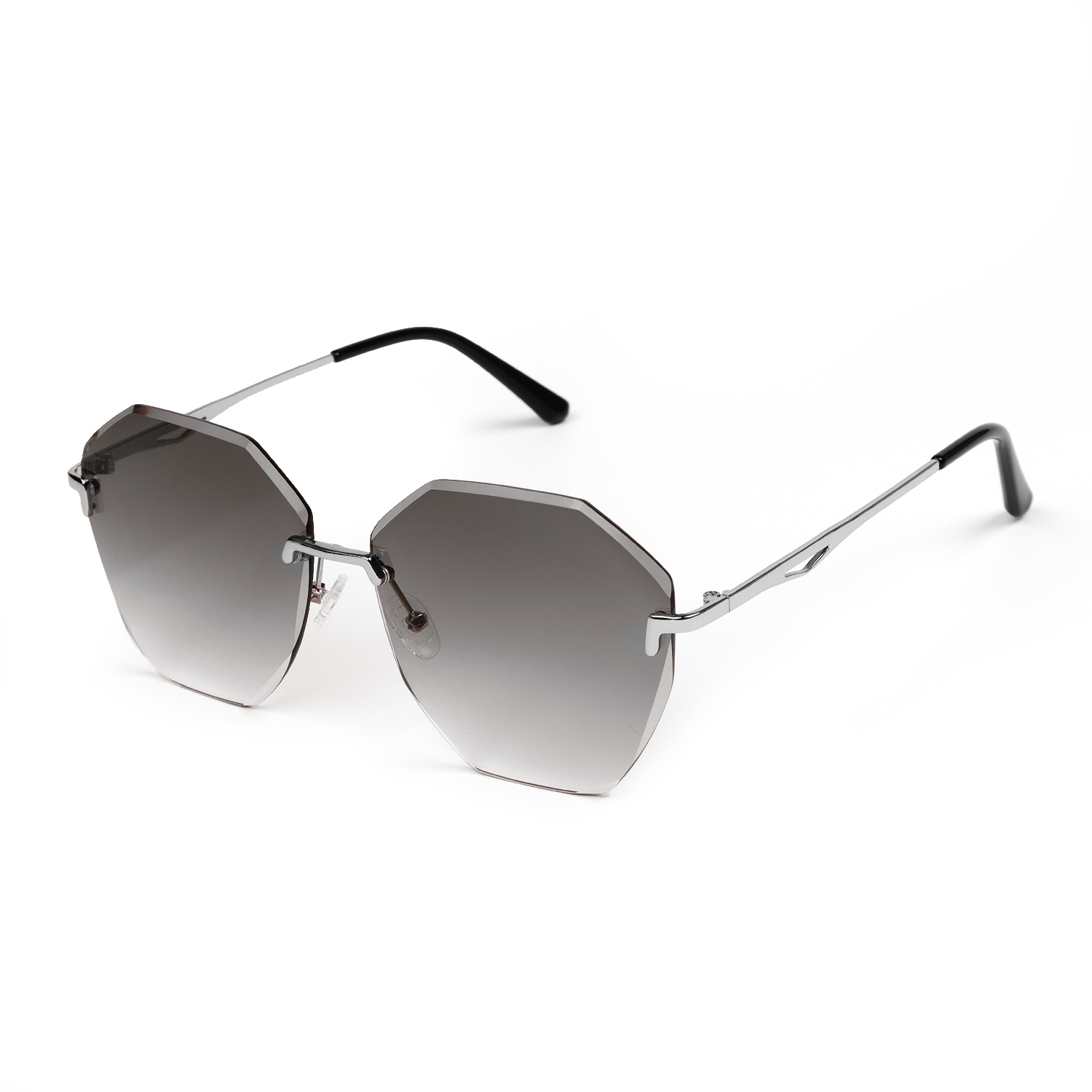 Солнцезащитные очки итальянского бренда FABRETTI необычной шестигранной формы с серебристыми дужками. Градиентные серые линзы позволяют видеть одинаково хорошо как в помещении, так и на улице.