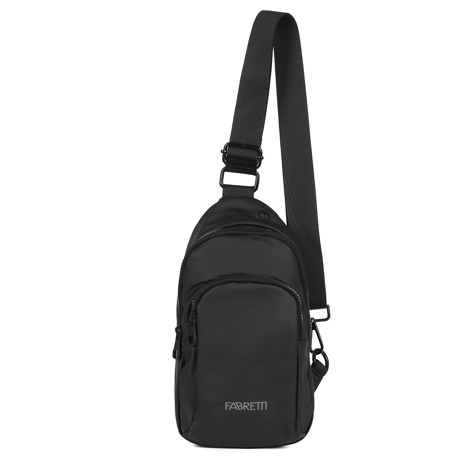 Cумка через плечо FABRETTI в черном цвете выполнена из влагостойкого гладкого нейлона. Основное отделение закрывается на полукруглую молнию. Внутри есть боковой карман на молнии. В верхней части предусмотрен разъем для проводных наушников. На лицевой стороне изделия расположен вместительный карман на молнии. На тыльной стороне есть потайной открытый карман на липучке. Сумку можно носить через плечо, а также на плече - переместив регулируемую по длине лямку. Сумка прекрасно подойдёт для прогулок по городу, велосипедных поездок или путешествий.