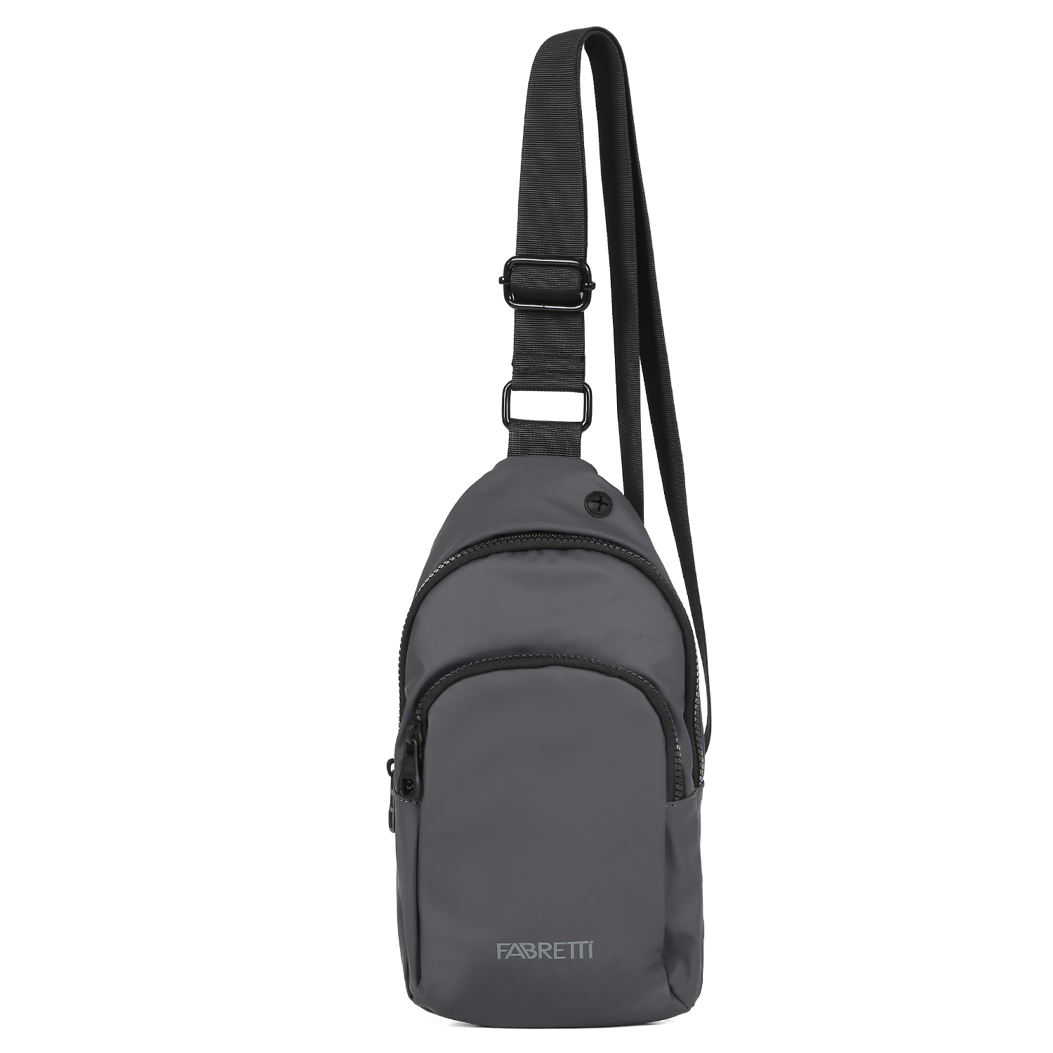 Cумка через плечо FABRETTI в темно-сером оттенке выполнена из влагостойкого гладкого нейлона. Основное отделение закрывается на полукруглую молнию. Внутри есть боковой карман на молнии. В верхней части предусмотрен разъем для проводных наушников. На лицевой стороне изделия расположен вместительный карман на молнии. На тыльной стороне есть потайной открытый карман на липучке. Сумку можно носить через плечо, а также на плече - переместив регулируемую по длине лямку. Сумка прекрасно подойдёт для прогулок по городу, велосипедных поездок или путешествий.
