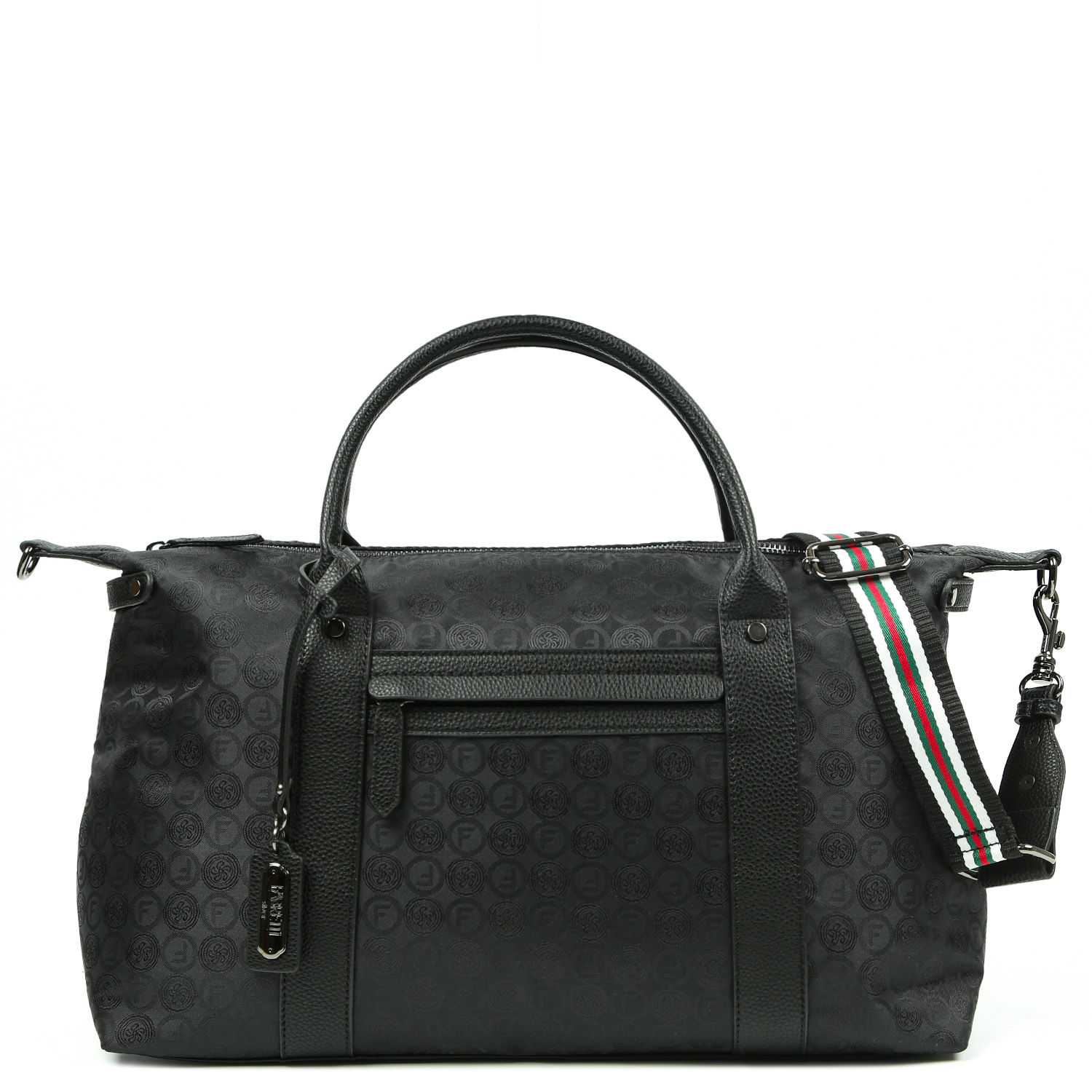 Компактная дорожная сумка FABRETTI в черном цвете декорирована узором в стиле «Логомания». Сумка выполнена из высокотехнологичного полиэстера с текстурой жаккард, устойчивого к воздействию влаги и перепаду температур.  Сумка отлично подойдет для поездки на выходные и вместит самые необходимые вещи для короткого путешествия. Просторное отделение закрывается на молнию. Внутри 3 боковых кармана для мелочей: 2 открытых и на молнии. На лицевой стороне расположен карман быстрого доступа на молнии. Ручки, дно и другие элементы отделки выполнены из экокожи. В комплект входит съемный плечевой ремень, длина которого регулируется, ширина - 4 см. Цвет фурнитуры - черненый никель.