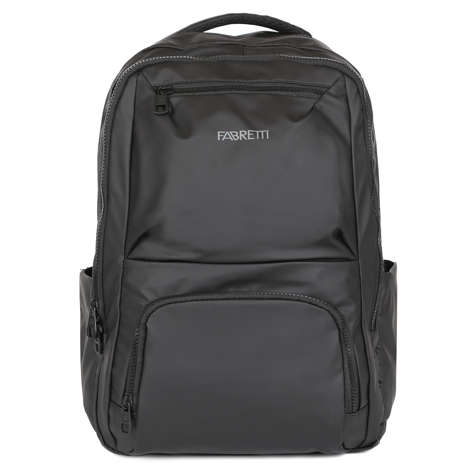 Вместительный текстильный рюкзак FABRETTI в черном цвете выполнен из высокотехнологичного влагостойкого нейлона и отличается особой функциональностью. Его размеры позволяют носить с собой все самое необходимое в путешествии. Аксессуар имеет 2 отделения.  Внутри одного из них есть секция на липучке для гаджетов. Во втором отделении находятся 3 кармана различной величины, в том числе для ручек. На лицевой стороне и на боковых стенках находятся по 2 кармана. На тыльной стороне расположен «рукав» для крепления рюкзака к ручке чемодана. На спинке и ремнях есть мягкие вставки. На ручках расположено дополнительное крепление для их надежной фиксации друг с другом.