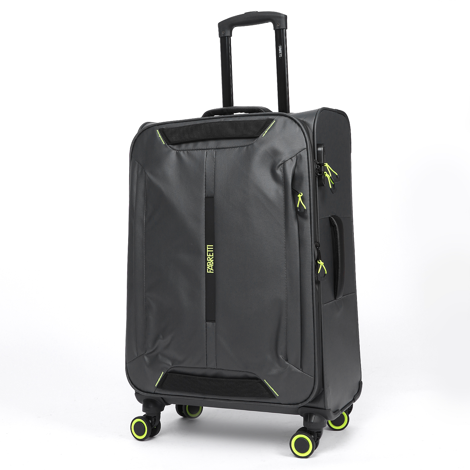 Средний текстильный чемодан FABRETTI в сером оттенке  выполнен из высокотехнологичного полиэстера, устойчивого к влаге и перепадам температур. Молния смещена к лицевой стороне, за счет чего чемодан открывается как цельное отделение, обеспечивая удобный и быстрый доступ к вещам. Внутри 1 вместительное отделение - с эластичными ремнями-фиксаторами и 2 карманами на молнии. Чемодан имеет дополнительную функцию расширения в виде прочной молнии на лицевой части чемодана по периметру корпуса, позволяя добавить до 5 см. к глубине чемодана. Так же, на лицевой стороне чемодана имеется вертикальный карман быстрого доступа на молнии. Выдвижная ручка фиксируется в 3-х положениях. Сверху, сбоку и на лицевой части предусмотрены дополнительные ручки для удобства переноски. 4 двойных колеса вращаются на 360°, позволяя чемодану двигаться легко и плавно. Кодовый замок обеспечивает сохранность багажа.