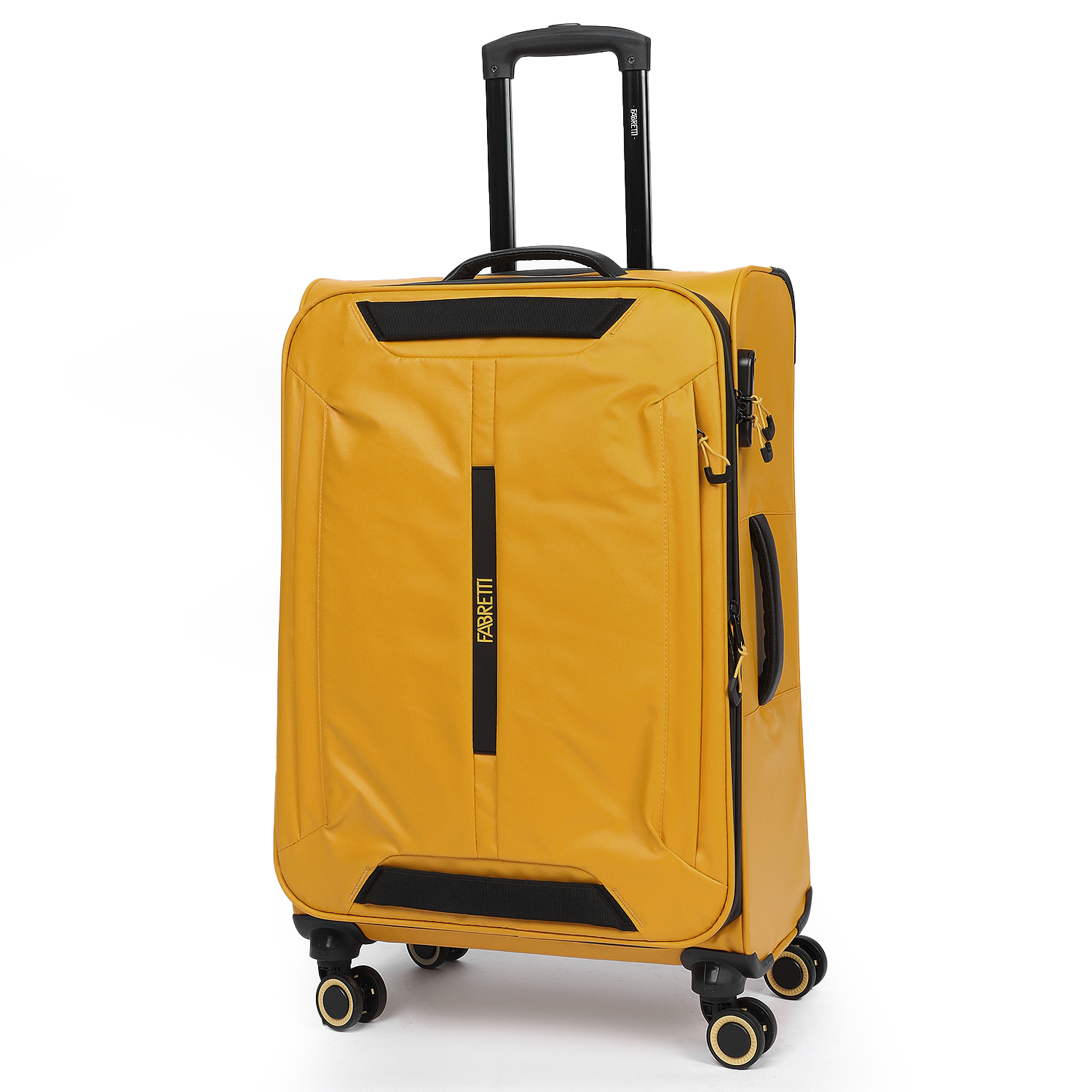 Средний текстильный чемодан FABRETTI в желтом оттенке  выполнен из высокотехнологичного полиэстера, устойчивого к влаге и перепадам температур. Молния смещена к лицевой стороне, за счет чего чемодан открывается как цельное отделение, обеспечивая удобный и быстрый доступ к вещам. Внутри 1 вместительное отделение - с эластичными ремнями-фиксаторами и 2 карманами на молнии. Чемодан имеет дополнительную функцию расширения в виде прочной молнии на лицевой части чемодана по периметру корпуса, позволяя добавить до 5 см. к глубине чемодана. Так же, на лицевой стороне чемодана имеется вертикальный карман быстрого доступа на молнии. Выдвижная ручка фиксируется в 3-х положениях. Сверху, сбоку и на лицевой части предусмотрены дополнительные ручки для удобства переноски. 4 двойных колеса вращаются на 360°, позволяя чемодану двигаться легко и плавно. Кодовый замок обеспечивает сохранность багажа.