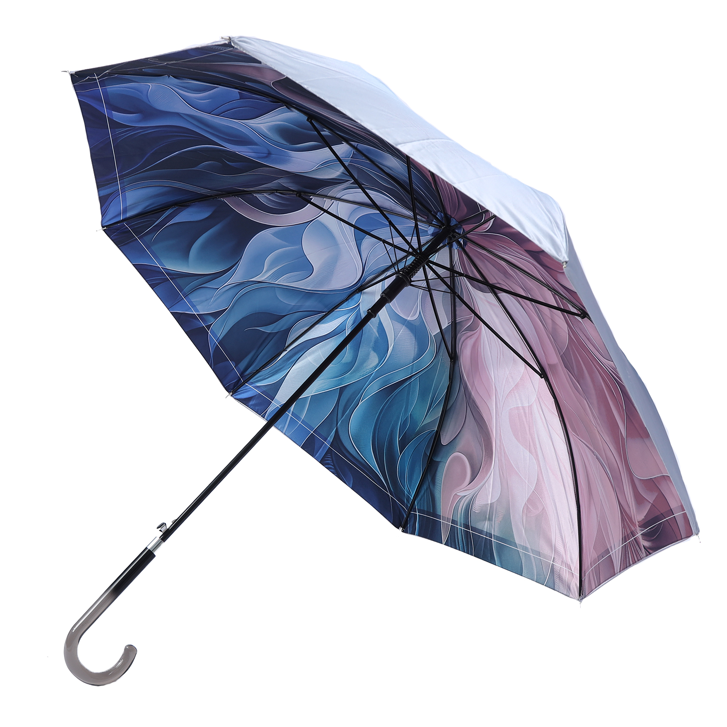 Двойной купол женского зонта-трости FABRETTI выполнен из полиэстера с приятной гладкой фактурой и сатиновым блеском. Верх – в градиентных тонах от ярко-голубого до бледно-голубого оттенка. Внутренняя сторона зонта украшена эффектным абстрактным принтом. Конструкция зонта изготовлена из прочной стали, эргономичная ручка, образующая изящный крюк, - из прозрачного пластика. Механизм модели - полуавтомат: открытие зонта кнопкой и закрытие вручную.  На чехле зонта предусмотрены 2 лямки, позволяющие комфортно носить аксессуар в руке или на плечах.