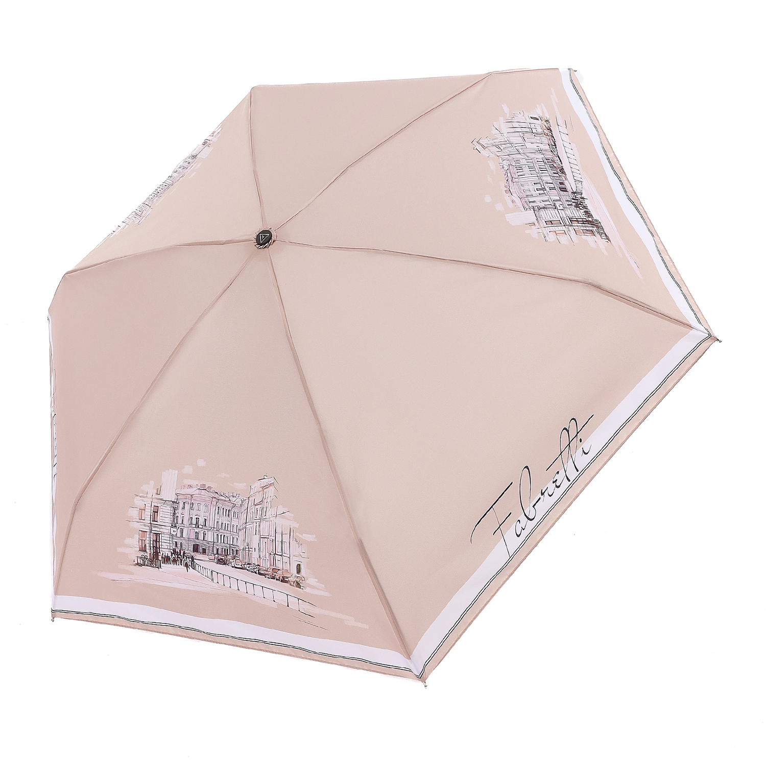 Миниатюрный женский зонт-автомат четвертного сложения от итальянского бренда FABRETTI  в бежевых тонах с современным городским пейзажем.