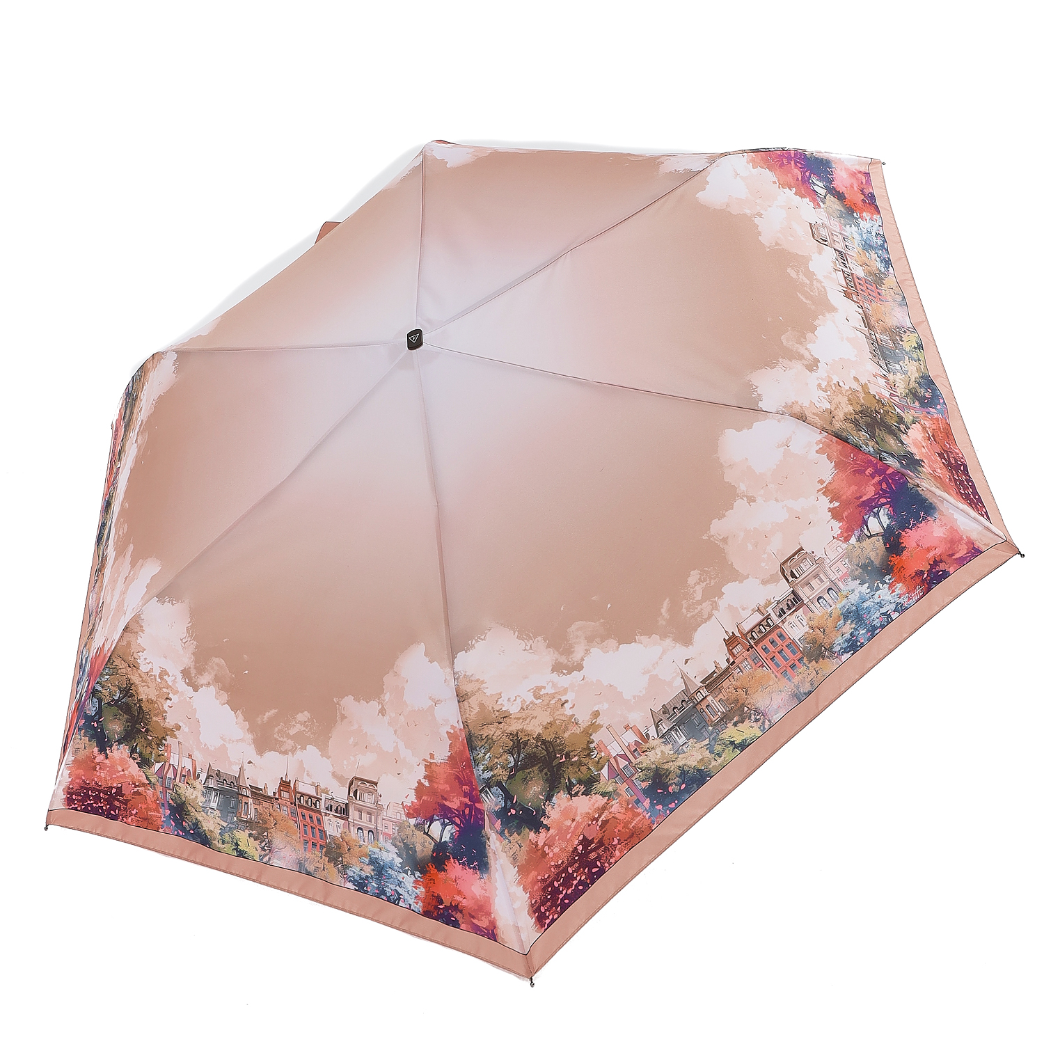 Удобный женский зонт-автомат с плоской ручкой итальянского бренда FABRETTI с куполом бежевого цвета, украшенным сложным многоцветным принтом, изображающим городской пейзаж.