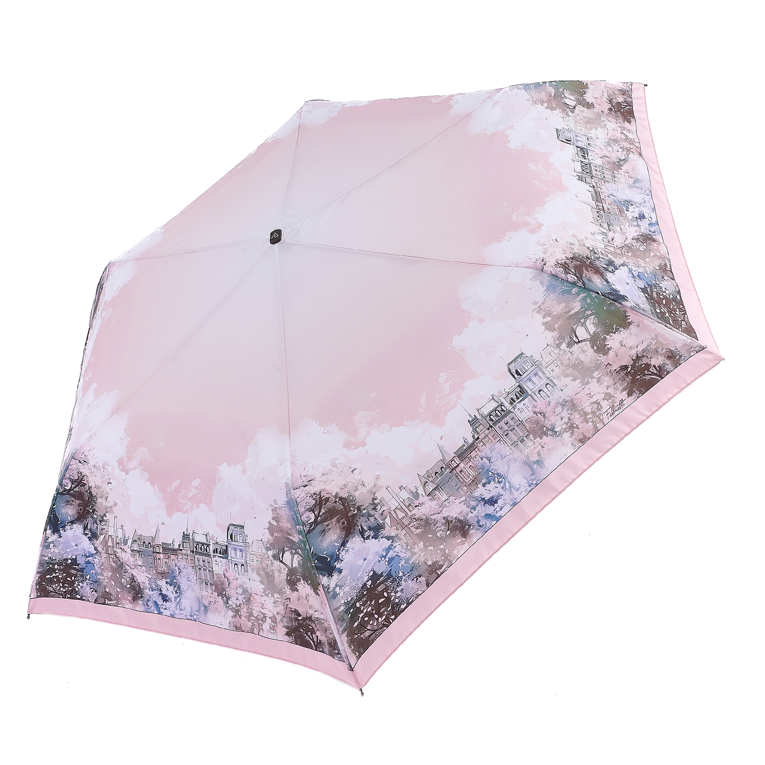 Удобный женский зонт-автомат с плоской ручкой итальянского бренда FABRETTI с куполом пыльно-розового цвета, украшенным сложным многоцветным принтом, изображающим весенний городской пейзаж.