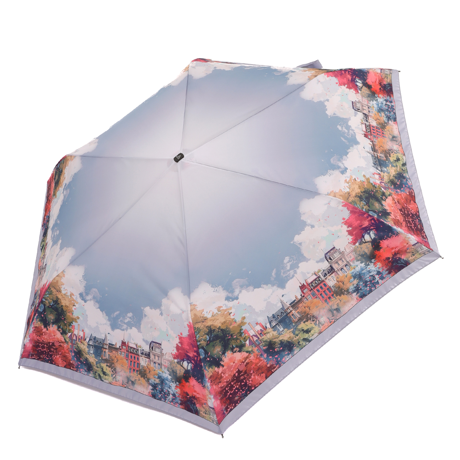 Удобный женский зонт-автомат с плоской ручкой итальянского бренда FABRETTI с куполом пыльно-голубого цвета, украшенным сложным многоцветным принтом, изображающим осенний городской пейзаж.