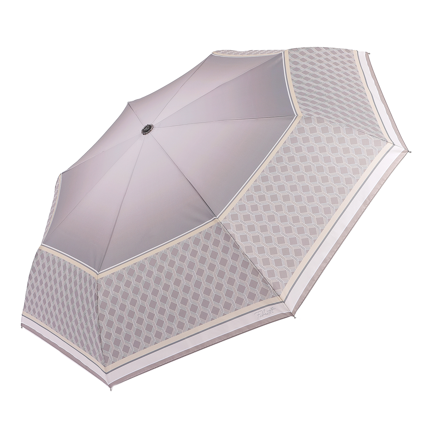 Небольшой женский зонт-автомат итальянского бренда FABRETTI, украшенный сложным геометрическим узором-сеткой на бежево-сером фоне.