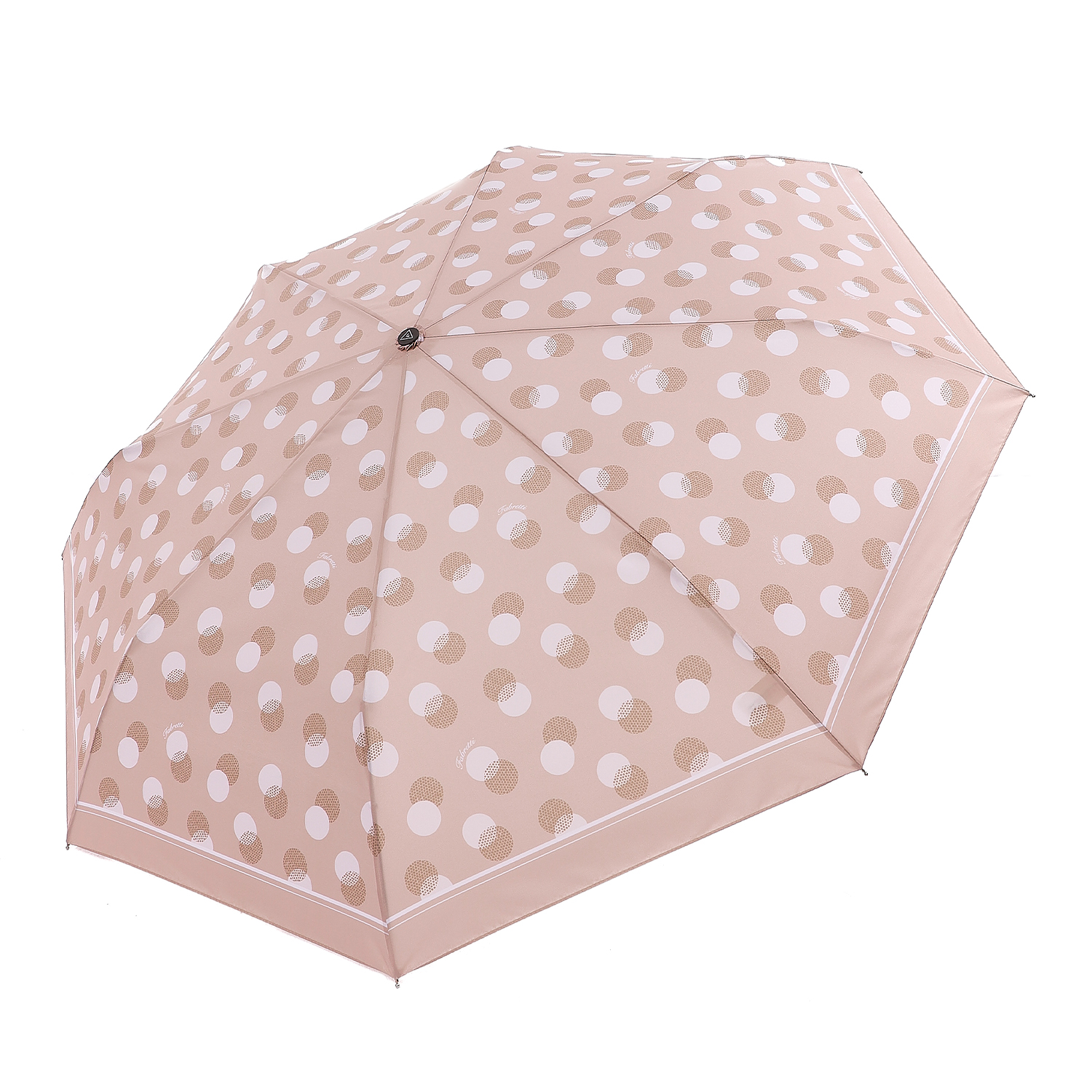 Небольшой женский зонт-автомат итальянского бренда FABRETTI, украшенный крупными белыми и коричневыми горошинами на бежевом фоне.