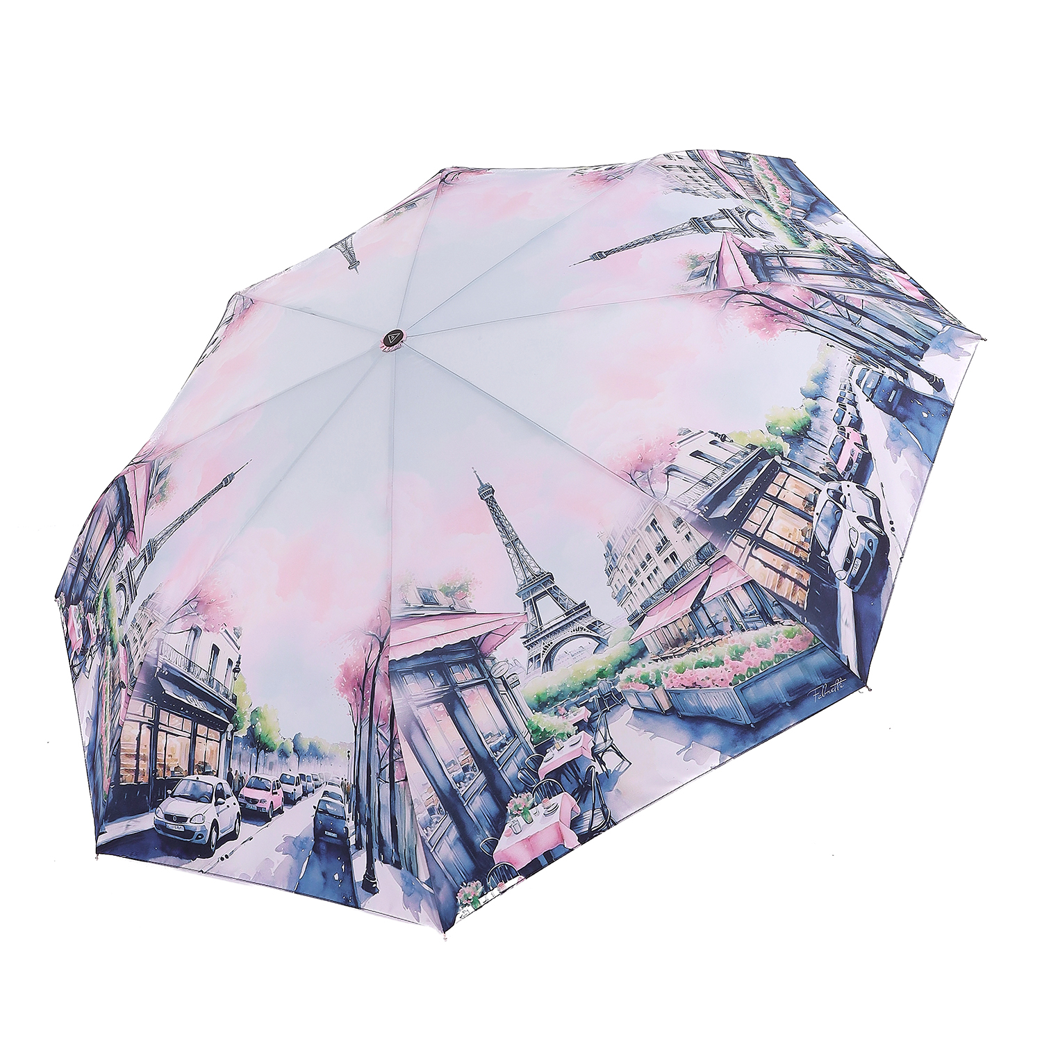 Небольшой женский зонт-автомат итальянского бренда FABRETTI, украшенный романтичным акварельным рисунком Эйфелевой башни и парижских улочек. Купол выполнен из материала с матовой фактурой эпонж. Она придает ткани высокую прочность и устойчивость к выцветанию. Вода, попадая на такой купол, превращается в капли и легко скатываться вниз.