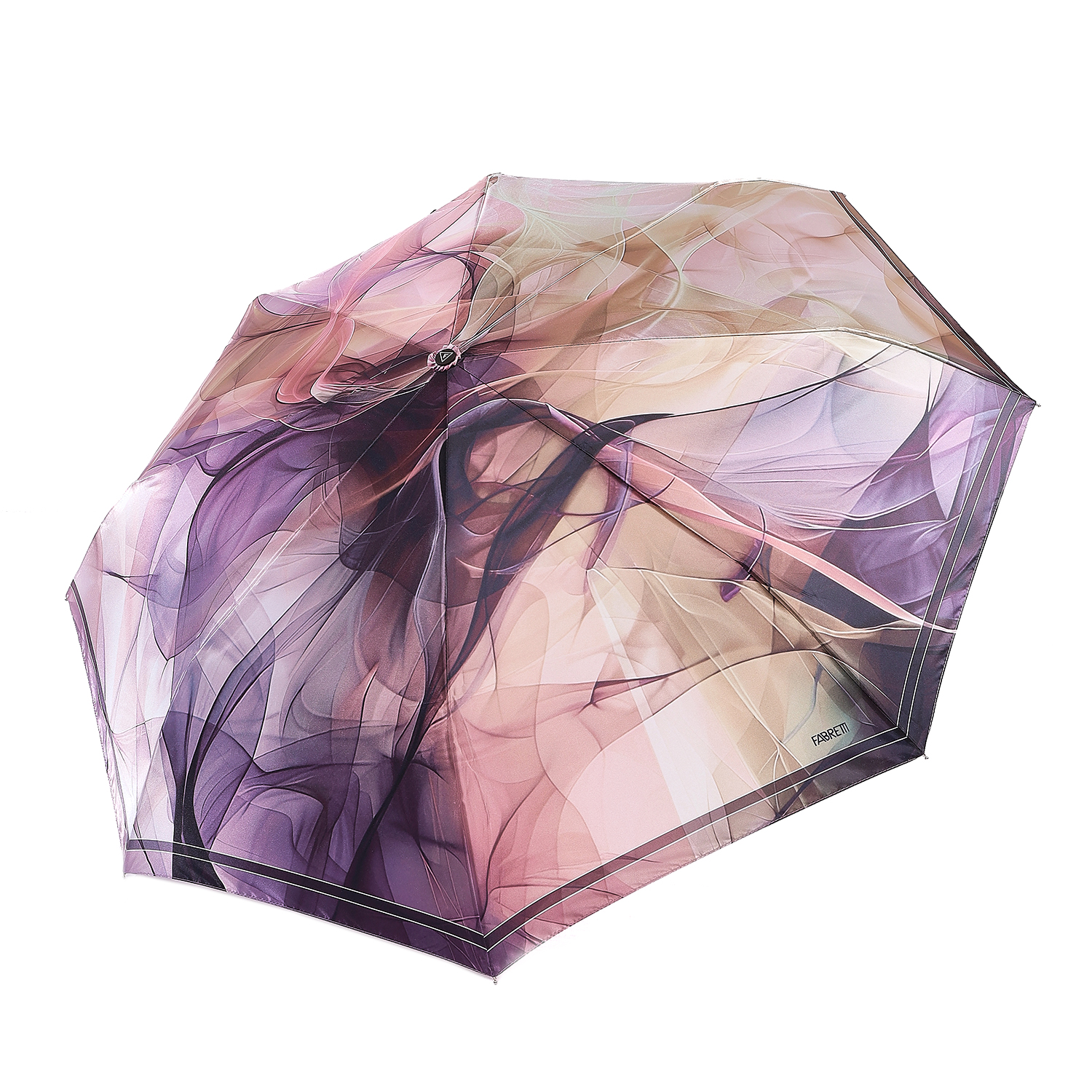 Зонт-автомат тройного сложения итальянского бренда FABRETTI с невероятным ярким принтом из абстрактных разводов и градиентов бежевых, розовых и фиолетовых оттенков. Купол выполнен из гладкого искусственного сатина с шелковистой фактурой и мягким блеском.