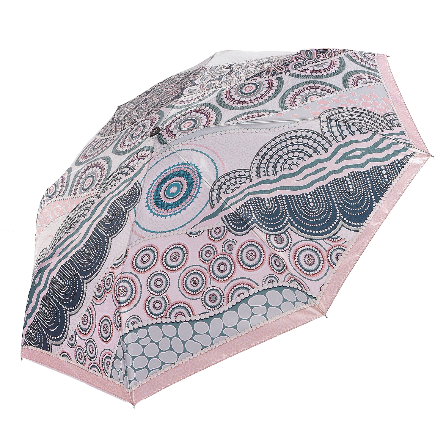 Зонт-автомат тройного сложения итальянского бренда FABRETTI с интересным абстрактным узором, сложенным из горошин разного размера, цвета и формы в серо-голубых и нежно-розовых тонах. Купол выполнен из гладкого искусственного сатина с шелковистой фактурой и мягким блеском.