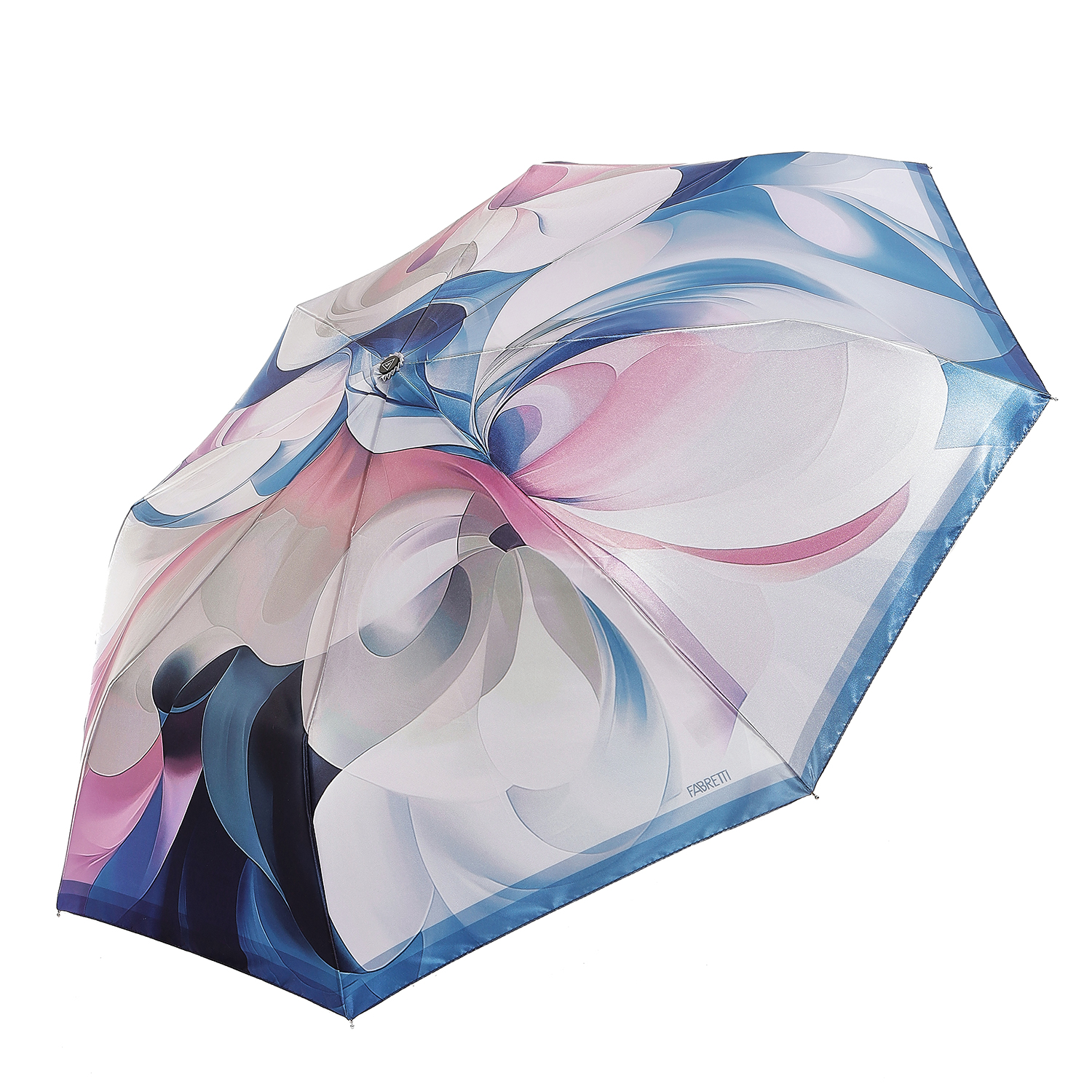 Зонт-автомат тройного сложения итальянского бренда FABRETTI с невероятным нежным принтом из абстрактных акварельных разводов и градиентов голубых, розовых и бежевых оттенков. Купол выполнен из гладкого искусственного сатина с шелковистой фактурой и мягким блеском.