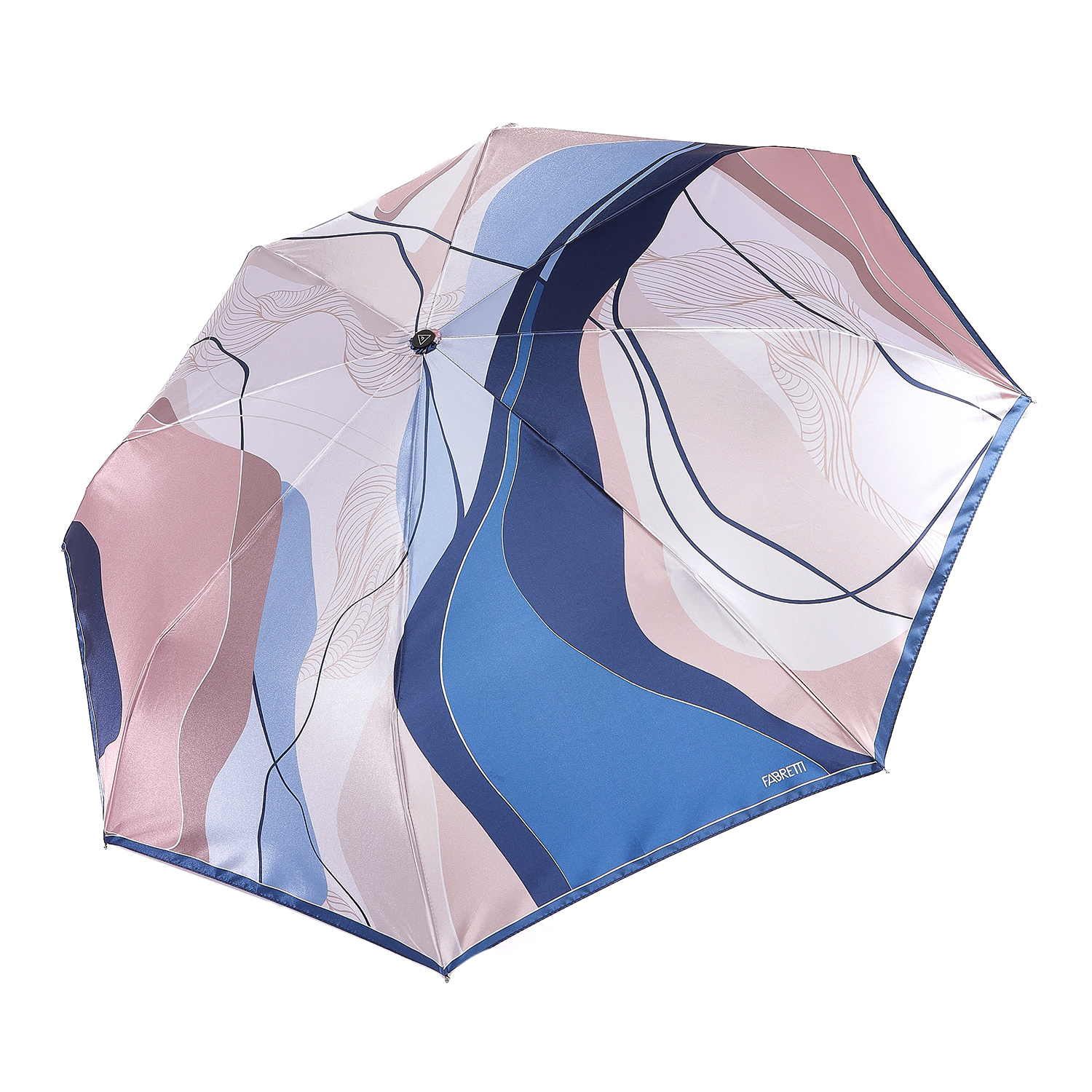 Зонт-автомат тройного сложения итальянского бренда FABRETTI со сложным абстрактным узором, разводами, линиями и полосками в оттенках голубого и бежевого. Купол выполнен из гладкого искусственного сатина с шелковистой фактурой и мягким блеском.