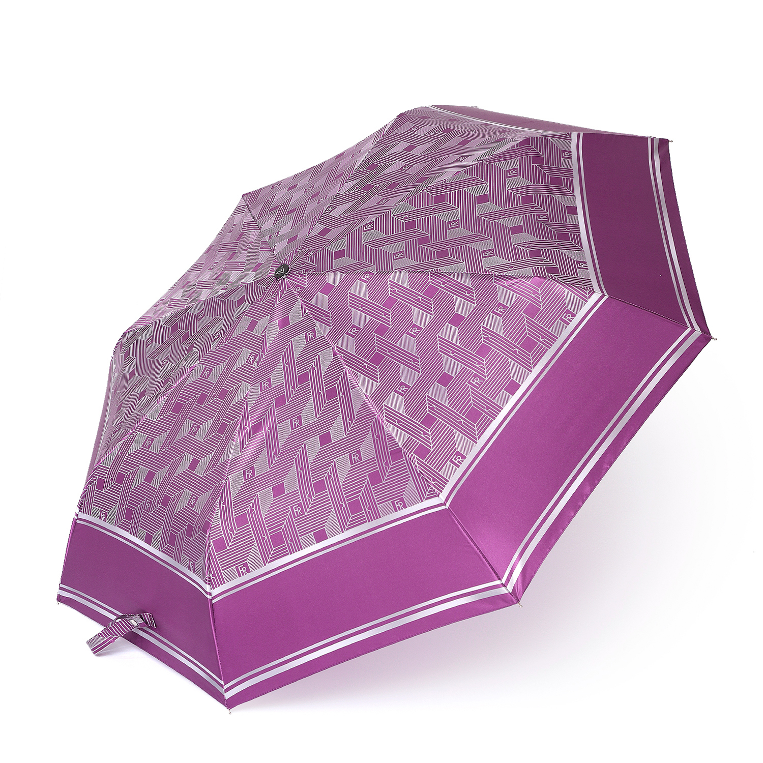 Зонт-автомат тройного сложения итальянского бренда FABRETTI украшен сложным геометрическим узором светло-серого цвета на благородном пурпурно-фиолетовом фоне. Купол выполнен из гладкого искусственного сатина с шелковистой фактурой и мягким блеском.