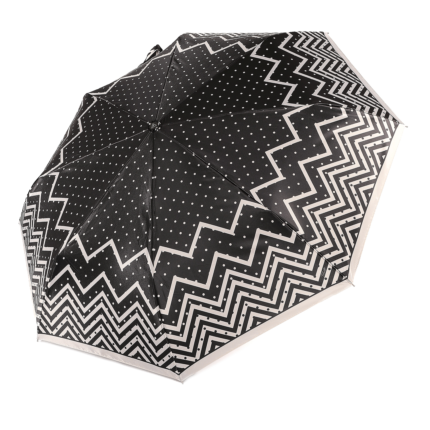 Зонт-автомат тройного сложения итальянского бренда FABRETTI с куполом черного цвета, украшенным монохромным узором в горошек и контрастными линиями. Купол выполнен из гладкого искусственного сатина с шелковистой фактурой и мягким блеском.