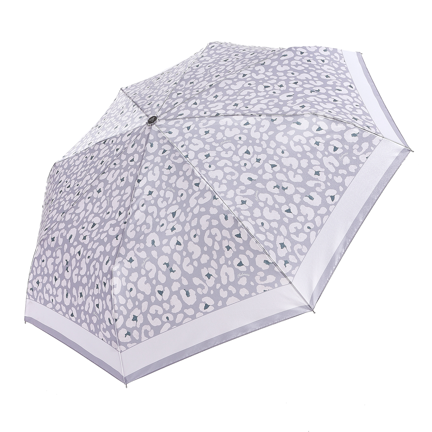 Зонт-автомат тройного сложения итальянского бренда FABRETTI с куполом серого цвета, украшенным абстрактным принтом, напоминающим леопардовый узор. Купол выполнен из гладкого искусственного сатина с шелковистой фактурой и мягким блеском.
