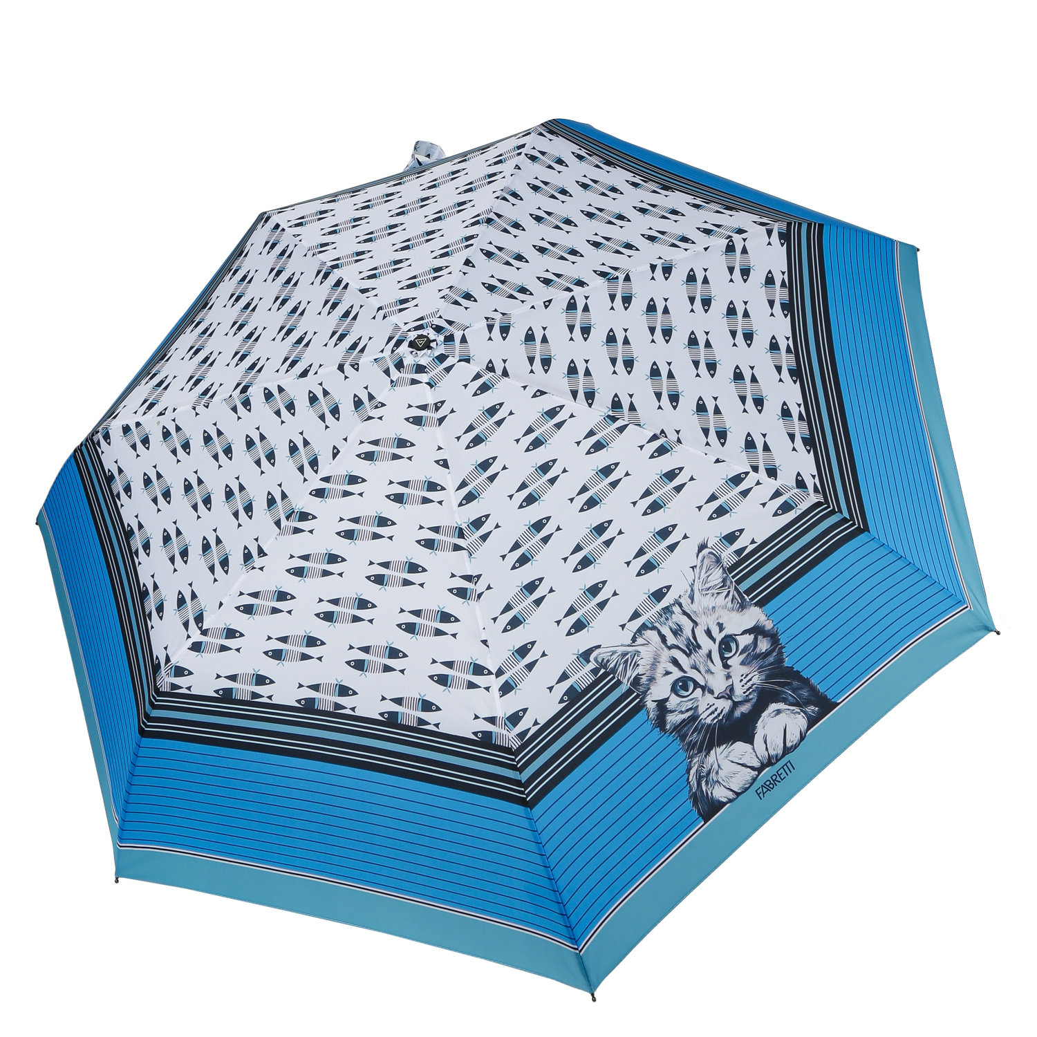 Зонт-автомат FABRETTI выделяется ярким принтом купола, который выполнен из полиэстера с плетением нити - эпонж. Такое плетение помимо матовой фактуры придает ткани высокую прочность и устойчивость к выцветанию. Дизайн зонта сочетает в себе изображение котенка и стилизованных рыб. Эргономичная ручка выполнена из пластика. Каркас изготовлен из стали. Аксессуар снабжен автоматическим механизмом сложения. Облегченная конструкция создает дополнительный комфорт при использовании зонта. Комплекс пружин и звеньев спиц сделаны из гибкого и упругого материала углепластика и фибергласса и составляют основу системы «антиветер».